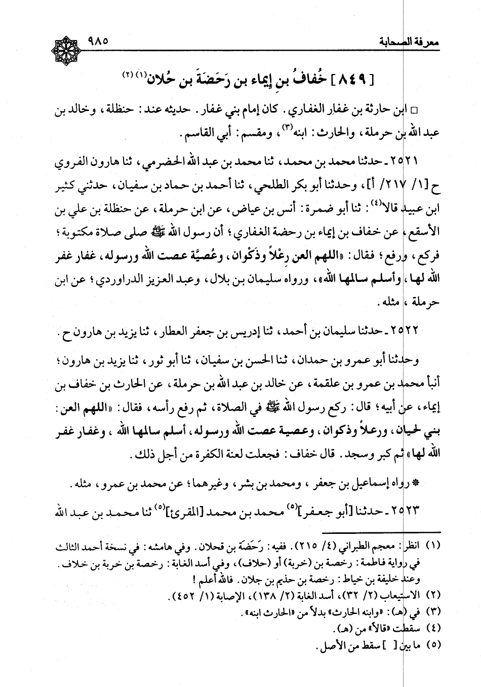 ٢٥٢١ - حَدَّثَنَا مُحَمَّدُ بْنُ مُحَمَّدٍ، ثنا مُحَمَّدُ بْنُ عَبْدِ اللهِ الْحَضْرَمِيُّ، ثنا هَارُونُ الْفَرْوِيُّ، ح وَحَدَّثَنَا أَبُو بَكْرٍ الطَّلْحِيُّ، ثنا أَحْمَدُ بْنُ حَمَّادِ بْنِ سُفْيَانَ، حَدَّثَنِي كَثِيرُ بْنُ عُبَيْدٍ، قَالَا: ثنا أَبُو ضَمْرَةَ: أَنَسُ بْنُ عِيَاضٍ، عَنِ ابْنِ حَرْمَلَةَ، عَنْ حَنْظَلَةَ بْنِ عَلِيِّ بْنِ الْأَسْقَعِ، عَنْ خُفَافِ بْنِ إِيمَاءِ بْنِ رَحْضَةَ الْغِفَارِيِّ، أَنَّ رَسُولَ اللهِ صَلَّى اللَّهُ عَلَيْهِ وَسَلَّمَ صَلَّى صَلَاةً مَكْتُوبَةً، فَرَكَعَ، وَرَفَعَ، فَقَالَ: «اللهُمَّ الْعَنْ رِعْلًا وَذَكْوَانَ، وَعُصَيَّةَ عَصَتِ اللهَ وَرَسُولَهُ، غِفَارٌ غَفَرَ اللهُ لَهَا، وَأَسْلَمُ سَالَمَهَا اللهُ» وَرَوَاهُ سُلَيْمَانُ بْنُ بِلَالٍ، وَعَبْدُ الْعَزِيزِ الدَّرَاوَرْدِيُّ، عَنِ ابْنِ حَرْمَلَةَ، مِثْلَهُ