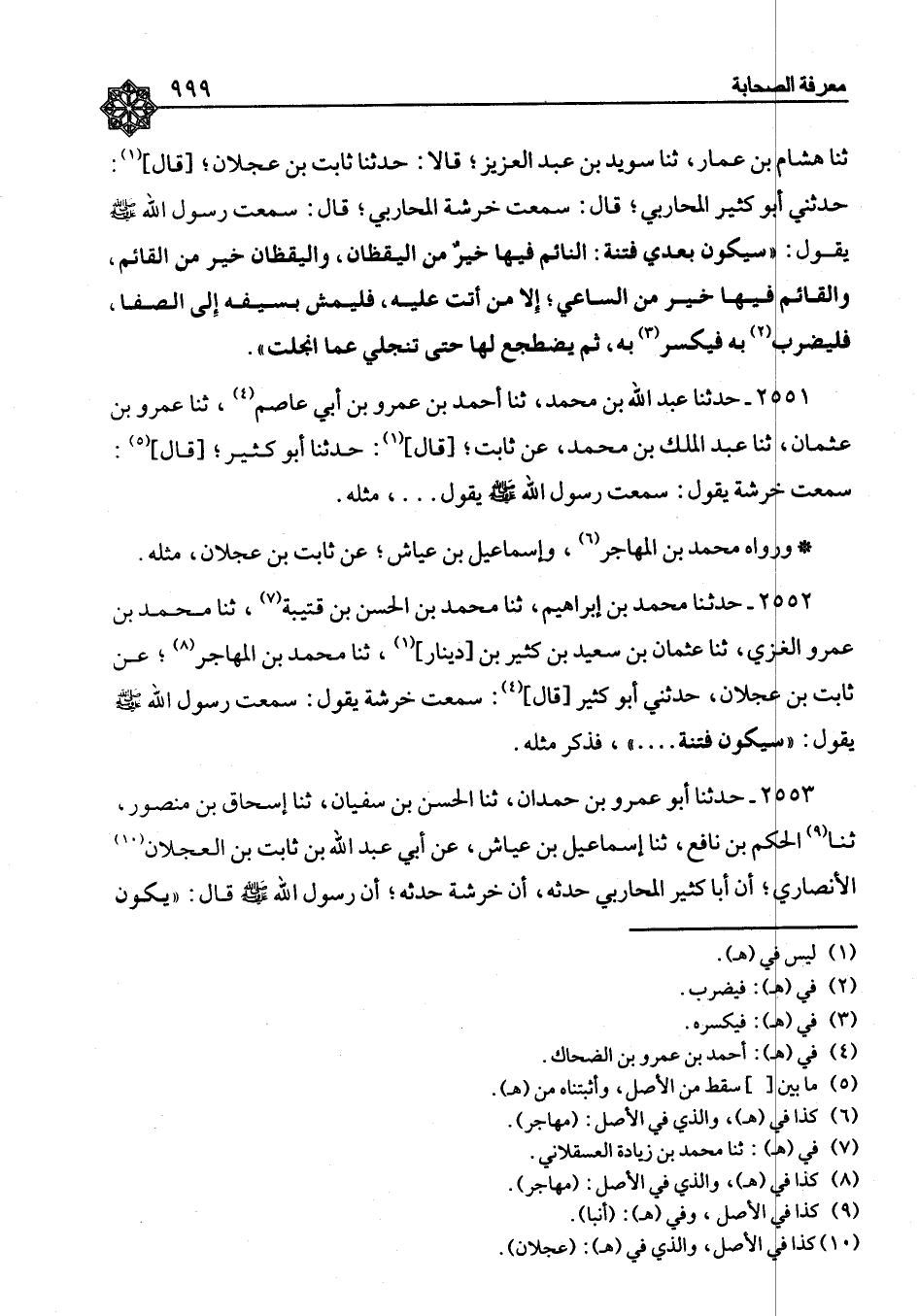 ٢٥٥٣ - حَدَّثَنَا أَبُو عَمْرِو بْنُ حَمْدَانَ، ثنا الْحَسَنُ بْنُ سُفْيَانَ، ثنا إِسْحَاقُ بْنُ مَنْصُورٍ، ثنا الْحَكَمُ بْنُ نَافِعٍ، ثنا إِسْمَاعِيلُ بْنُ عَيَّاشٍ، عَنْ أَبِي عَبْدِ اللهِ بْنِ ثَابِتِ بْنِ الْعَجْلَانِ الْأَنْصَارِيِّ، أَنَّ أَبَا كَثِيرٍ الْمُحَارِبِيَّ حَدَّثَهُ، أَنَّ خَرَشَةَ حَدَّثَهُ: أَنَّ رَسُولَ اللهِ صَلَّى اللَّهُ عَلَيْهِ وَسَلَّمَ قَالَ: " يَكُونُ ⦗١٠٠٠⦘ بَعْدِي فِتَنٌ: النَّائِمُ فِيهَا خَيْرٌ مِنَ الْيَقْظَانِ " فَذَكَرَ مِثْلَهُ