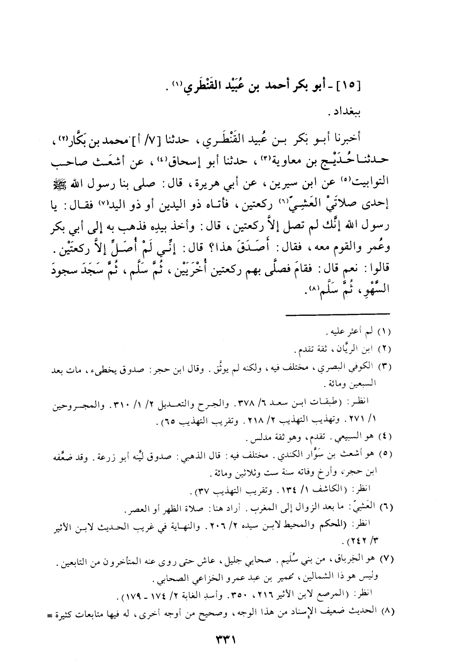 أَخْبَرَنَا أَبُو بَكْرِ بْنُ عُبَيْدٍ الْقَنْطَرِيُّ، حَدَّثَنَا مُحَمَّدُ بْنُ بَكَّارٍ، حَدَّثَنَا حُدَيْجُ بْنُ مُعَاوِيَةَ، حَدَّثَنَا أَبُو إِسْحَاقَ، عَنْ أَشْعَثَ، صَاحِبِ التَّوَابِيتِ، عَنِ ابْنِ سِيرِينَ، عَنْ أَبِي هُرَيْرَةَ، قَالَ: صَلَّى بِنَا رَسُولُ اللَّهِ صَلَّى اللهُ عَلَيْهِ وَسَلَّمَ إِحْدَى صَلَاتَيِ الْعَشِيِّ رَكْعَتَيْنِ، فَأَتَاهُ ذُو الْيَدَيْنِ أَوْ ذُو الْيَدِ فَقَالَ: يَا رَسُولَ اللَّهِ، إِنَّكَ لَمْ تُصَلِّ إِلَّا رَكْعَتَيْنِ. قَالَ: وَأَخَذَ بِيَدِهِ، فَذَهَبَ بِهِ إِلَى أَبِي بَكْرٍ وَعُمَرَ وَالْقَوْمُ مَعَهُ، فَقَالَ: " أَصَدَقَ هَذَا؟ قَالَ: إِنِّي لَمْ أُصَلِّ إِلَّا رَكْعَتَيْنِ ". قَالُوا: نَعَمْ. قَالَ: فَقَامَ، فَصَلَّى بِهِمْ رَكْعَتَيْنِ أُخْرَيَيْنِ ثُمَّ سَلَّمَ، ثُمَّ سَجَدَ سُجُودَ السَّهْوِ ثُمَّ سَلَّمَ "