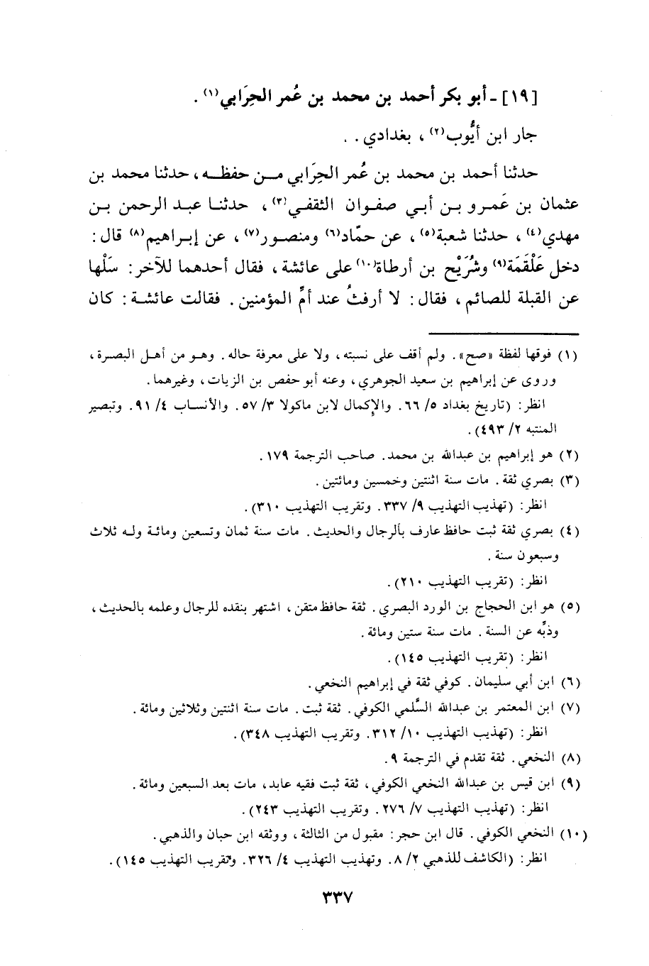 19 - أَبُو بَكْرٍ أَحْمَدُ بْنُ مُحَمَّدِ بْنِ عُمَرَ الْحِرَابِيُّ، جَارُ ابْنِ أَيُّوبَ، بَغْدَادِيٌّ