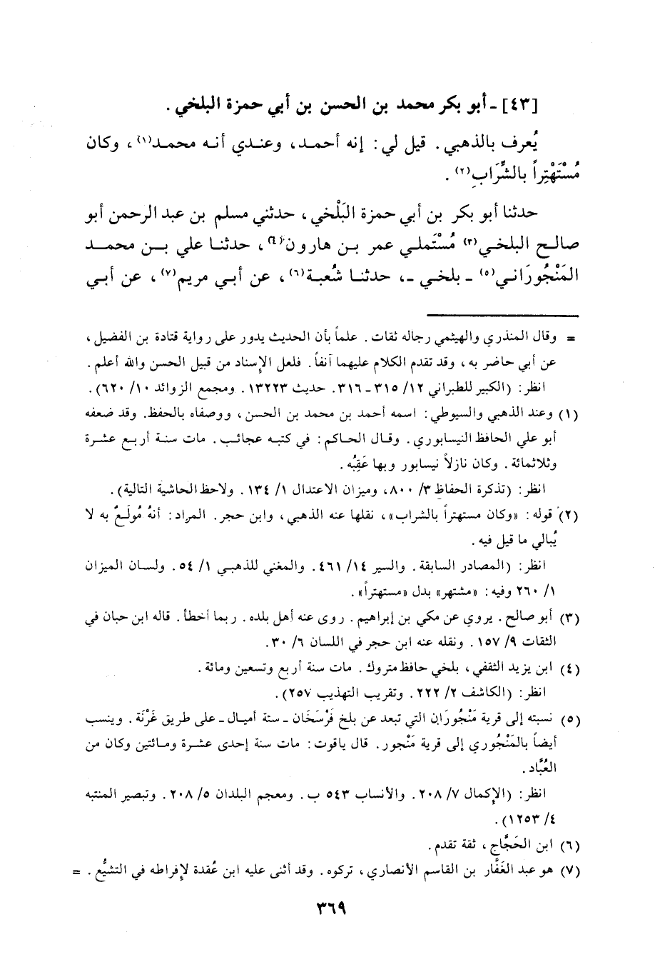 43 - أَبُو بَكْرٍ مُحَمَّدُ بْنُ الْحَسَنِ بْنِ أَبِي حَمْزَةَ الْبَلْخِيُّ يُعْرَفُ بِالذَّهَبِيِّ، قِيلَ لِي: إِنَّهُ أَحْمَدُ، وَعِنْدِي أَنَّهُ مُحَمَّدٌ، وَكَانَ مُسْتَهْتِرًا بِالشَّرَابِ