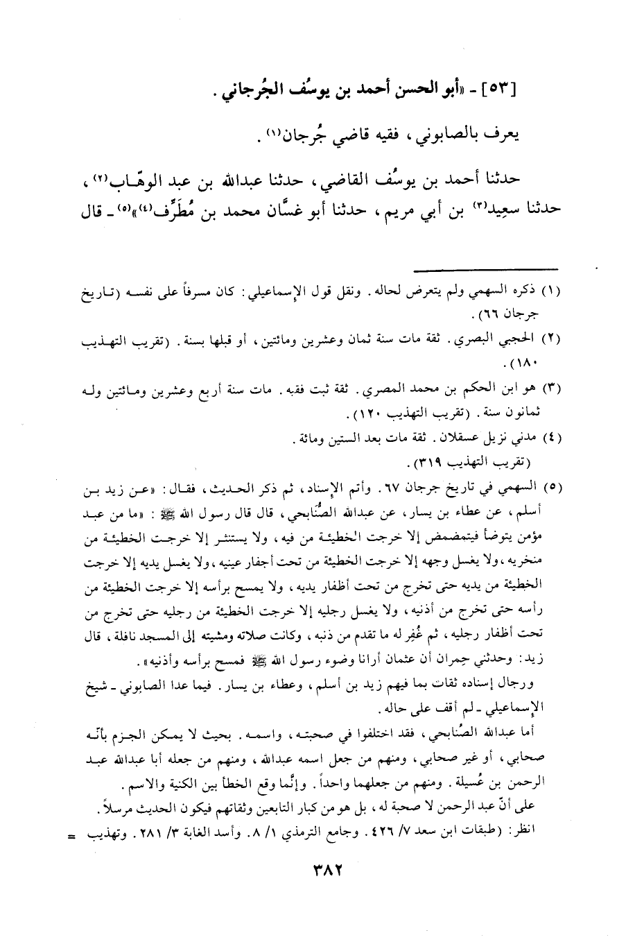 53 - أَبُو الْحَسَنِ أَحْمَدُ بْنُ يُوسُفَ الْجُرْجَانِيُّ يُعْرَفُ بِالصَّابُونِيِّ، فَقِيهٌ، قَاضِي جُرْجَانَ. حَدَّثَنَا أَحْمَدُ بْنُ يُوسُفَ الْقَاضِي، حَدَّثَنَا عَبْدُ اللَّهِ بْنُ عَبْدِ الْوَهَّابِ، حَدَّثَنَا سَعِيدُ بْنُ أَبِي مَرْيَمَ، حَدَّثَنَا أَبُو غَسَّانَ مُحَمَّدُ بْنُ مُطَرِّفٍ. قَالَ الْبَرْقَانِيُّ: كَتَبْتُهُ فِي جُمْلَةِ حَدِيثِ أَبِي غَسَّانَ "