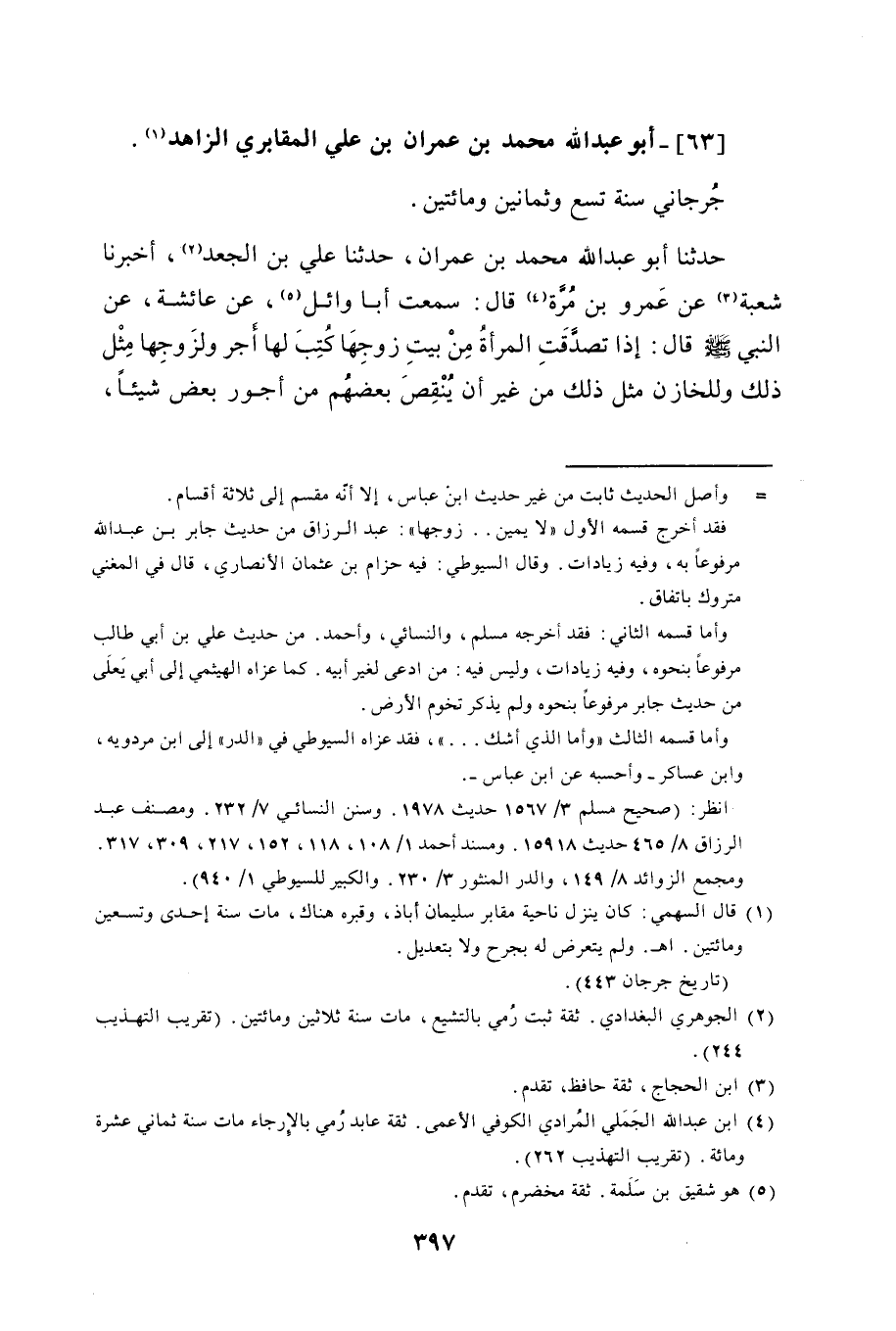 63 - أَبُو عَبْدِ اللَّهِ مُحَمَّدُ بْنُ عِمْرَانَ بْنِ عَلِيٍّ الْمَقَابِرِيُّ الزَّاهِدُ جُرْجَانِيٌّ، سَنَةَ تِسْعٍ وَثَمَانِينَ وَمِائَتَيْنِ