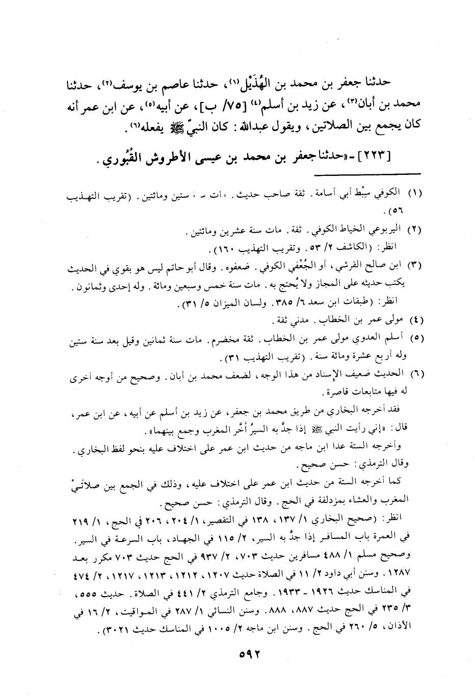 223 - حَدَّثَنَا جَعْفَرُ بْنُ مُحَمَّدِ بْنِ عِيسَى الْأَطْرُوشُ الْقُبُورِيُّ -[593]- بَغْدَادِيٌّ أَبُو الْفَضْلِ حَدَّثَنَا مُحَمَّدُ بْنُ حُمَيْدٍ، حَدَّثَنَا أَنَسُ بْنُ عَبْدِ الْحَمِيدِ، أَخُو جَرِيرِ بْنِ عَبْدِ الْحَمِيدِ، حَدَّثَنَا هِشَامُ بْنُ عُرْوَةَ، عَنْ أَبِيهِ، عَنْ عَائِشَةَ، قَالَتْ: سَمِعْتُ رَسُولَ اللَّهِ صَلَّى اللهُ عَلَيْهِ وَسَلَّمَ يَقُولُ: «مَنْ رَابَطَ فُوَاقَ نَاقَةٍ وَجَبَتْ لَهُ الْجَنَّةُ»