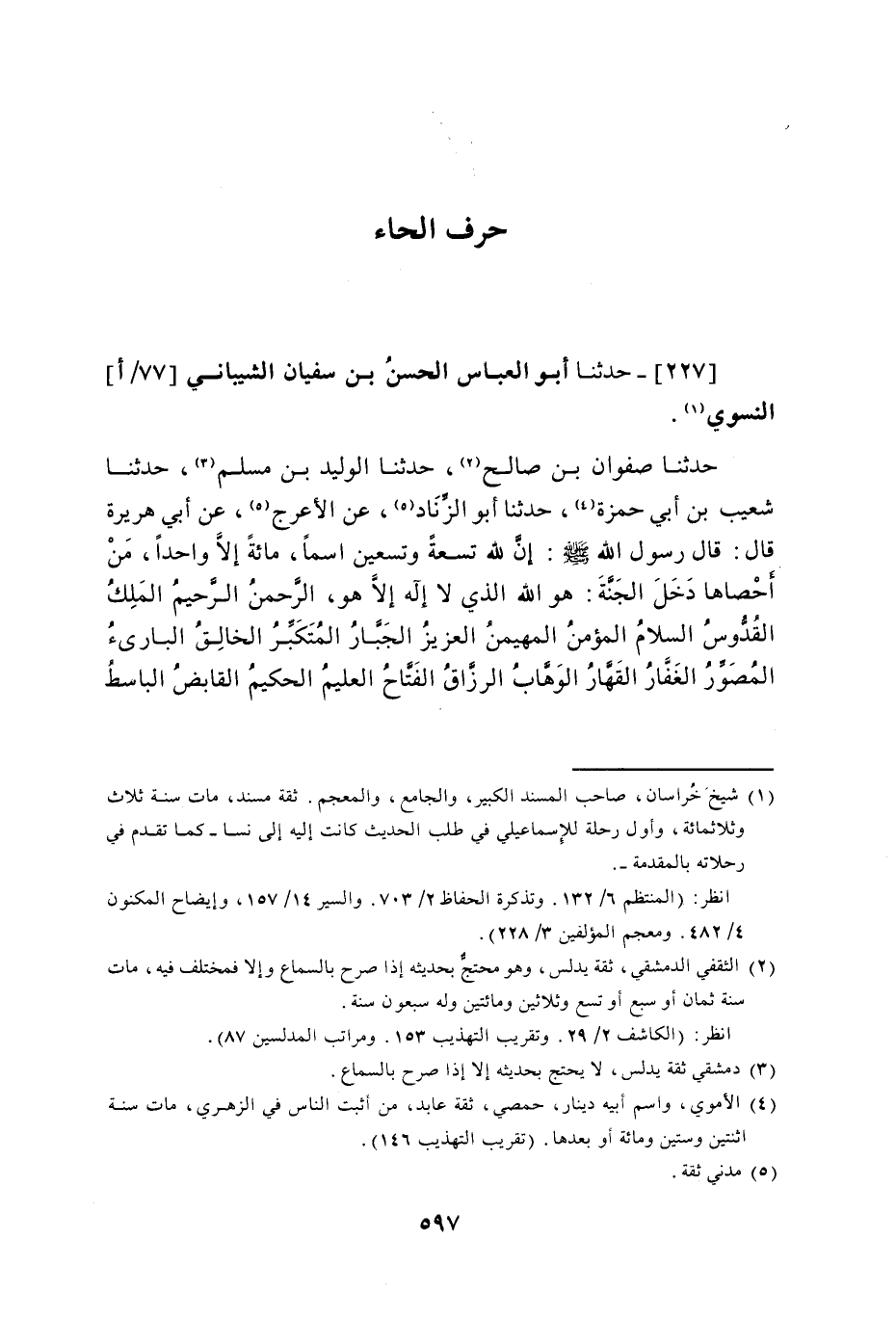 227 - حَدَّثَنَا أَبُو الْعَبَّاسِ الْحَسَنُ بْنُ سُفْيَانَ الشَّيْبَانِيُّ النَّسَوِيُّ حَدَّثَنَا صَفْوَانُ بْنُ صَالِحٍ، حَدَّثَنَا الْوَلِيدُ بْنُ مُسْلِمٍ، حَدَّثَنَا شُعَيْبُ بْنُ أَبِي حَمْزَةَ، حَدَّثَنَا أَبُو الزِّنَادِ، عَنِ الْأَعْرَجِ، عَنْ أَبِي هُرَيْرَةَ، قَالَ: قَالَ رَسُولُ اللَّهِ صَلَّى اللهُ عَلَيْهِ وَسَلَّمَ: «إِنَّ لِلَّهِ تِسْعَةً وَتِسْعِينَ اسْمًا، مِائَةً إِلَّا وَاحِدًا، مَنْ أَحْصَاهَا دَخَلَ الْجَنَّةَ، هُوَ اللَّهُ الَّذِي لَا إِلَهُ إِلَّا هُوَ الرَّحْمَنُ الرَّحِيمُ الْمَلِكُ الْقُدُّوسُ السَّلَامُ الْمُؤْمِنُ الْمُهَيْمِنُ الْعَزِيزُ الْجَبَّارُ الْمُتَكَبِّرُ الْخَالِقُ الْبَارِئُ الْمُصَوِّرُ الْغَفَّارُ الْقَهَّارُ الْوَهَّابُ الرَّزَّاقُ الْفَتَّاحُ الْعَلِيمُ الْحَكِيمُ الْقَابِضُ الْبَاسِطُ -[598]- الْحَافِظُ الرَّافِعُ الْمُعِزُّ الْمُذِلُّ السَّمِيعُ الْبَصِيرُ الْحَكَمُ الْعَدْلُ اللَّطِيفُ الْخَبِيرُ الْعَظِيمُ الْغَفُورُ الشَّكُورُ الْعَلِيُّ الْكَبِيرُ الْحَفِيظُ الْمُقِيتُ الْحَسِيبُ الْجَلِيلُ الْكَرِيمُ الرَّقِيبُ الْمُجِيبُ الْوَاسِعُ الْحَلِيمُ الْوَدُودُ الْمَجِيدُ الْبَاعِثُ الشَّهِيدُ الْحَقُّ الْوَكِيلُ الْقَوِيُّ الْمَتِينُ الْوَلِيُّ الْحَمِيدُ الْمُحْصِي الْمُبْدِئُ الْمُعِيدُ الْمُحْيِي الْمُمِيتُ الْحَيُّ الْقَيُّومُ الْوَاجِدُ الْمَاجِدُ الْوَاحِدُ الصَّمَدُ الْقَادِرُ الْمُقْتَدِرُ الْمُقَدِّمُ الْمُؤَخِّرُ الْأَوَّلُ الْآخَرُ الظَّاهِرُ الْبَاطِنُ الْبَرُّ التَّوَّابُ الْمُنْتَقِمُ الْعَفُوُّ الرَّءُوفُ مَالِكُ الْمُلْكِ ذُو الْجَلَالِ وَالْإِكْرَامِ الْوَالِي الْمُتَعَالِي الْمُقْسِطُ الْجَامِعُ الْغَنِيُّ الْمُغْنِي النَّافِعُ الضَّارُّ النُّورُ الْهَادِي الْبَدِيعُ الْبَاقِي الْوَارِثُ الرَّشِيدُ الصَّبُورُ»