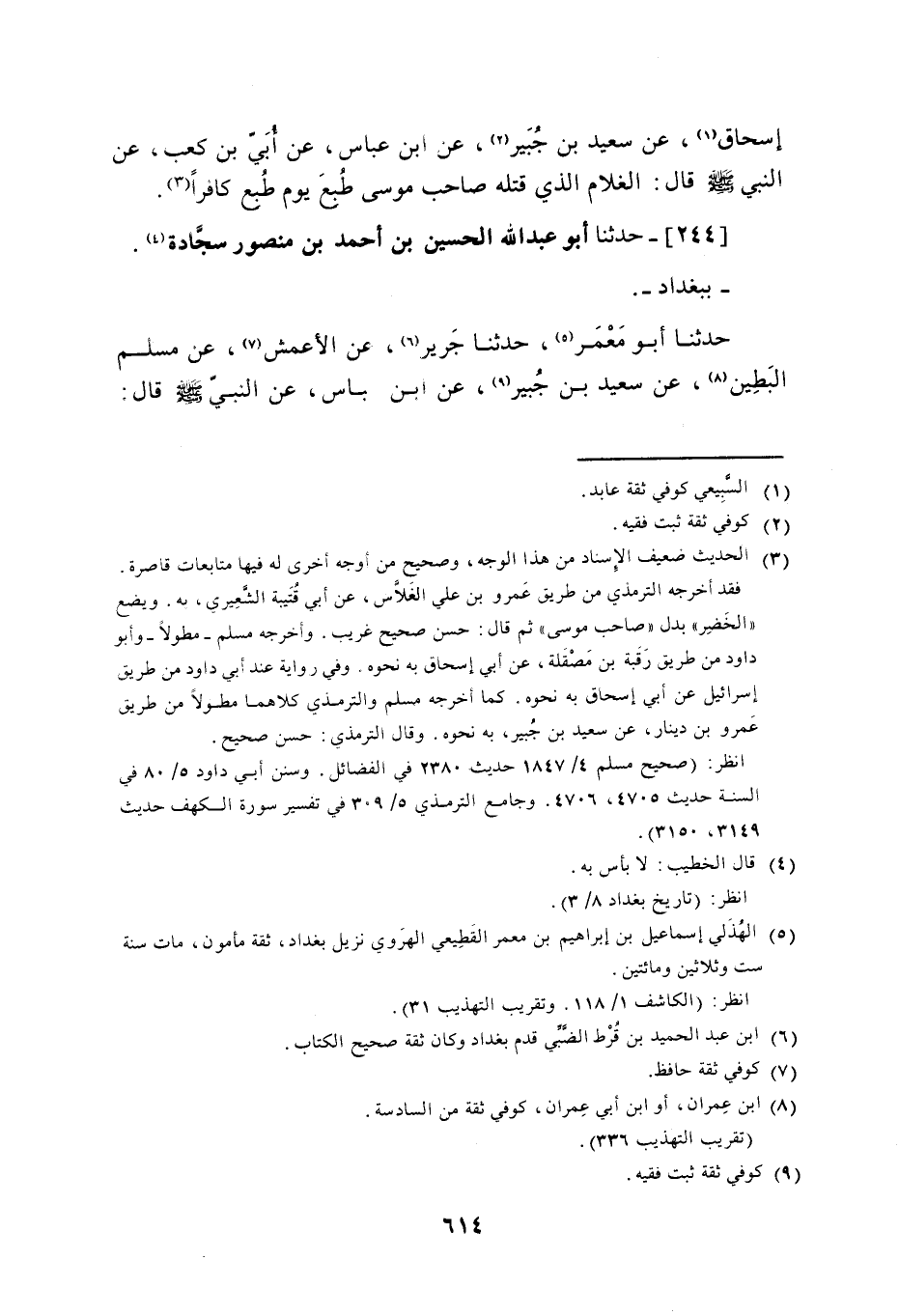 244 - حَدَّثَنَا أَبُو عَبْدِ اللَّهِ الْحُسَيْنُ بْنُ أَحْمَدَ بْنِ مَنْصُورٍ سَجَّادَةُ بِبَغْدَادَ حَدَّثَنَا أَبُو مَعْمَرٍ، حَدَّثَنَا جَرِيرٌ، عَنِ الْأَعْمَشِ، عَنْ مُسْلِمٍ الْبَطِينِ، عَنْ سَعِيدِ بْنِ جُبَيْرٍ، عَنِ ابْنِ عَبَّاسٍ، عَنِ النَّبِيِّ صَلَّى اللهُ عَلَيْهِ وَسَلَّمَ قَالَ -[615]-: «أُوتِيَ مُوسَى عَلَيْهِ السَّلَامُ الْأَلْوَاحَ، وَأُوتِيتُ الْمَثَانِيَ»
