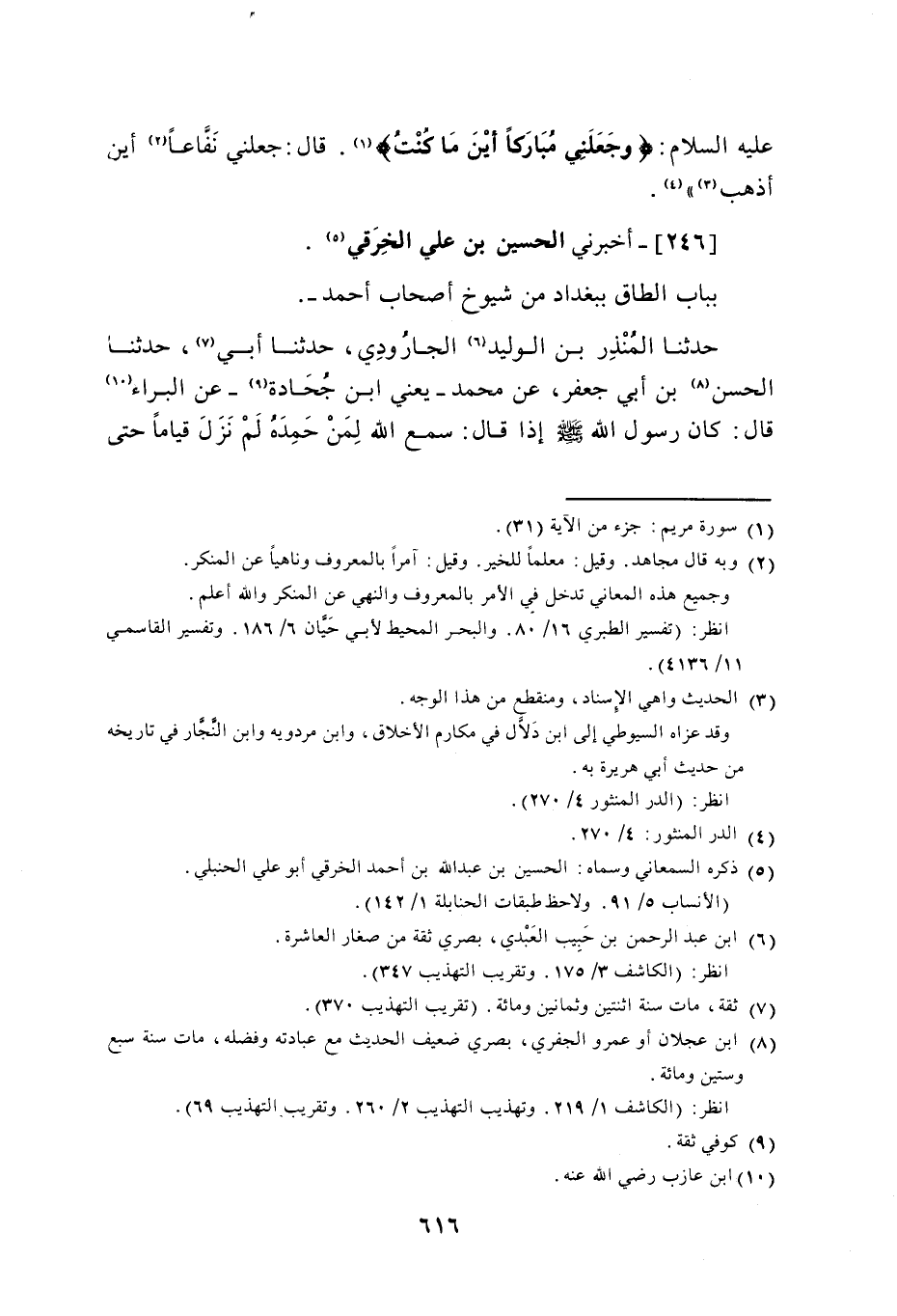 246 - أَخْبَرَنِي الْحُسَيْنُ بْنُ عَلِيٍّ الْخُرْقِيُّ بِبَابِ الطَّاقِ بِبَغْدَادَ، مِنْ شُيُوخِ أَصْحَابِ أَحْمَدَ حَدَّثَنَا الْمُنْذِرُ بْنُ الْوَلِيدِ الْجَارُودِيُّ، حَدَّثَنَا أَبِي، حَدَّثَنَا الْحَسَنُ بْنُ أَبِي جَعْفَرٍ، عَنْ مُحَمَّدٍ، يَعْنِي ابْنَ جُحَادَةَ، عَنِ الْبَرَاءِ، قَالَ: " كَانَ رَسُولُ اللَّهِ صَلَّى اللهُ عَلَيْهِ وَسَلَّمَ إِذَا قَالَ: «سَمِعَ اللَّهُ لِمَنْ حَمِدَهُ» لَمْ نَزَلْ قِيَامًا حَتَّى -[617]- تَقَعَ جَبْهَتُهُ إِلَى الْأَرْضِ. فَذَكَرْتُ قَوْلَهُ لِلْحَكَمِ، فَقَالَ: حَدَّثَنِيهِ عَبْدُ الرَّحْمَنِ بْنُ أَبِي لَيْلَى، عَنِ الْبَرَاءِ