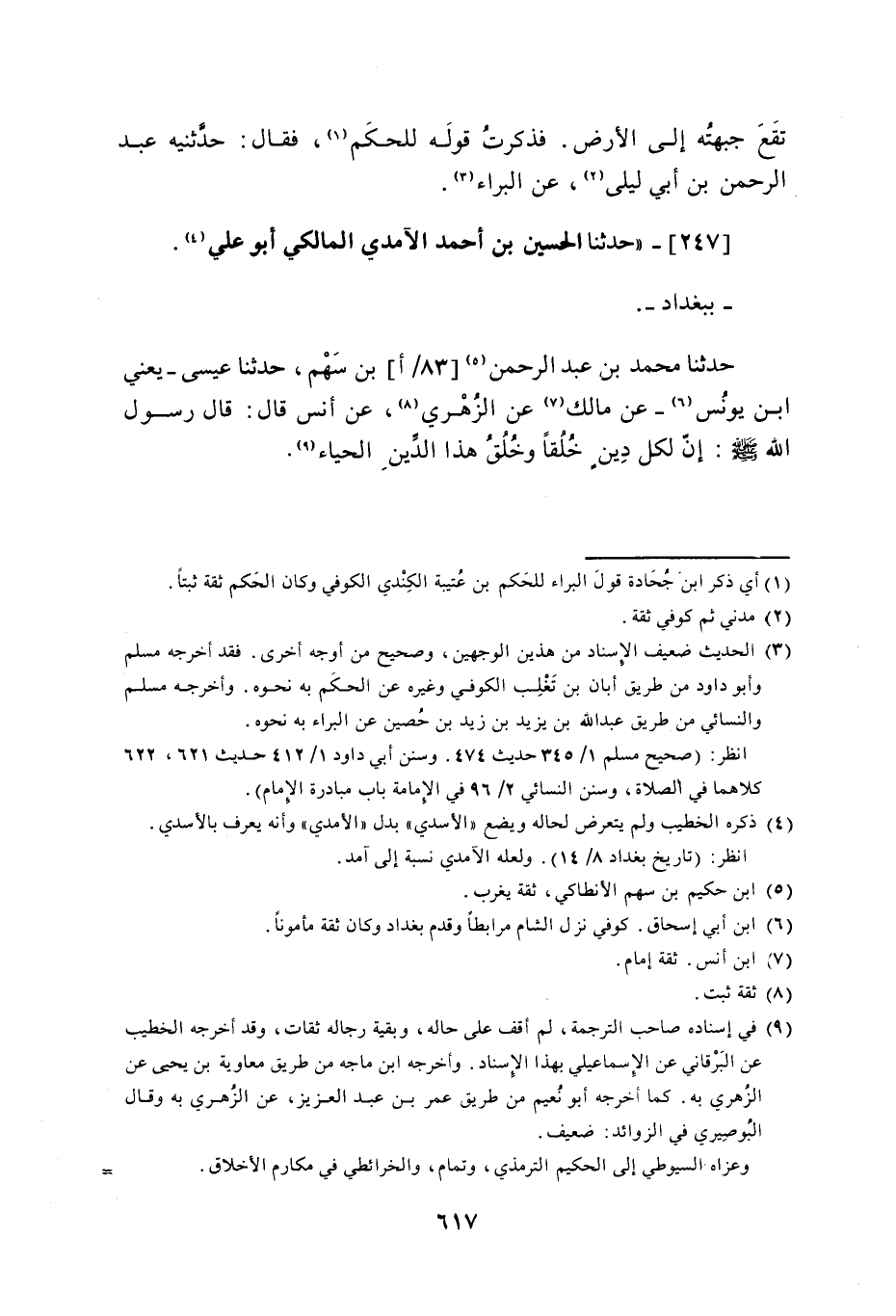247 - حَدَّثَنَا الْحُسَيْنُ بْنُ أَحْمَدَ الْآمِدِيُّ الْمَالِكِيُّ أَبُو عَلِيٍّ بِبَغْدَادَ حَدَّثَنَا مُحَمَّدُ بْنُ عَبْدِ الرَّحْمَنِ بْنِ سَهْمٍ، حَدَّثَنَا عِيسَى، يَعْنِي ابْنَ يُونُسَ، عَنْ مَالِكٍ، عَنِ الزُّهْرِيِّ، عَنْ أَنَسٍ، قَالَ: قَالَ رَسُولُ اللَّهِ صَلَّى اللهُ عَلَيْهِ وَسَلَّمَ: «إِنَّ لِكُلِّ دِينٍ خُلُقًا، وَخُلُقُ هَذَا الدِّينِ الْحَيَاءُ»