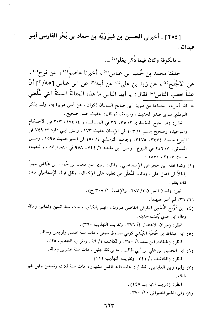 254 - أَخْبَرَنِي الْحُسَيْنُ بْنُ شِيرَوَيْهِ بْنِ حَمَّادِ بْنِ بَحْرٍ الْفَارِسِيُّ أَبُو عَبْدِ اللَّهِ بِالْكُوفَةِ، وَكَانَ فِيمَا ذُكِرَ يَغْلُو، حَدَّثَنَا مُحَمَّدُ بْنُ حُمَيْدِ بْنِ عَبَّاسٍ، أَخْبَرَنَا عَاصِمٌ، عَنْ نُوحٍ، عَنِ الْأَجْلَحِ، عَنْ زَيْدِ بْنِ عَلِيٍّ، عَنْ أَبِيهِ، عَنِ ابْنِ عَبَّاسٍ، أَنَّ عَلِيًّا " خَطَبَ النَّاسَ فَقَالَ: يَا أَيُّهَا النَّاسُ، مَا هَذِهِ الْمَقَالَةُ السَّيِّئَةُ الَّتِي تَبْلُغُنِي -[624]- عَنْكُمْ؟ وَاللَّهِ لَيُقْتَلَنَّ طَلْحَةُ وَالزُّبَيْرُ، وَلَتُفْتَحَنَّ الْبَصْرَةُ، وَلَتَأْتِيَنَّكُمْ مَادَّةً مِنَ الْكُوفَةِ سِتَّةُ آلَافٍ وَخَمْسُمِائَةٍ وَسِتُّونَ، أَوْ خَمْسَةُ آلَافٍ وَسِتُّمِائَةٍ وَخَمْسُونَ. قَالَ ابْنُ عَبَّاسٍ: فَقُلْتُ: وَالْحَرْبُ خَدْعَةٌ، قَالَ: فَخَرَجْتُ فَأَقْبَلْتُ أَسْأَلُ النَّاسَ: كَمْ أَنْتُمْ؟ فَقَالُوا كَمَا قَالَ، فَقُلْتُ: هَذَا بِمَا أَسَرَّ إِلَيْهِ رَسُولُ اللَّهِ صَلَّى اللهُ عَلَيْهِ وَسَلَّمَ، إِنَّهُ عَلَّمَهُ أَلْفَ كَلِمَةٍ، كُلُّ كَلِمَةٍ تَفْتَحُ أَلْفَ كَلِمَةٍ "
