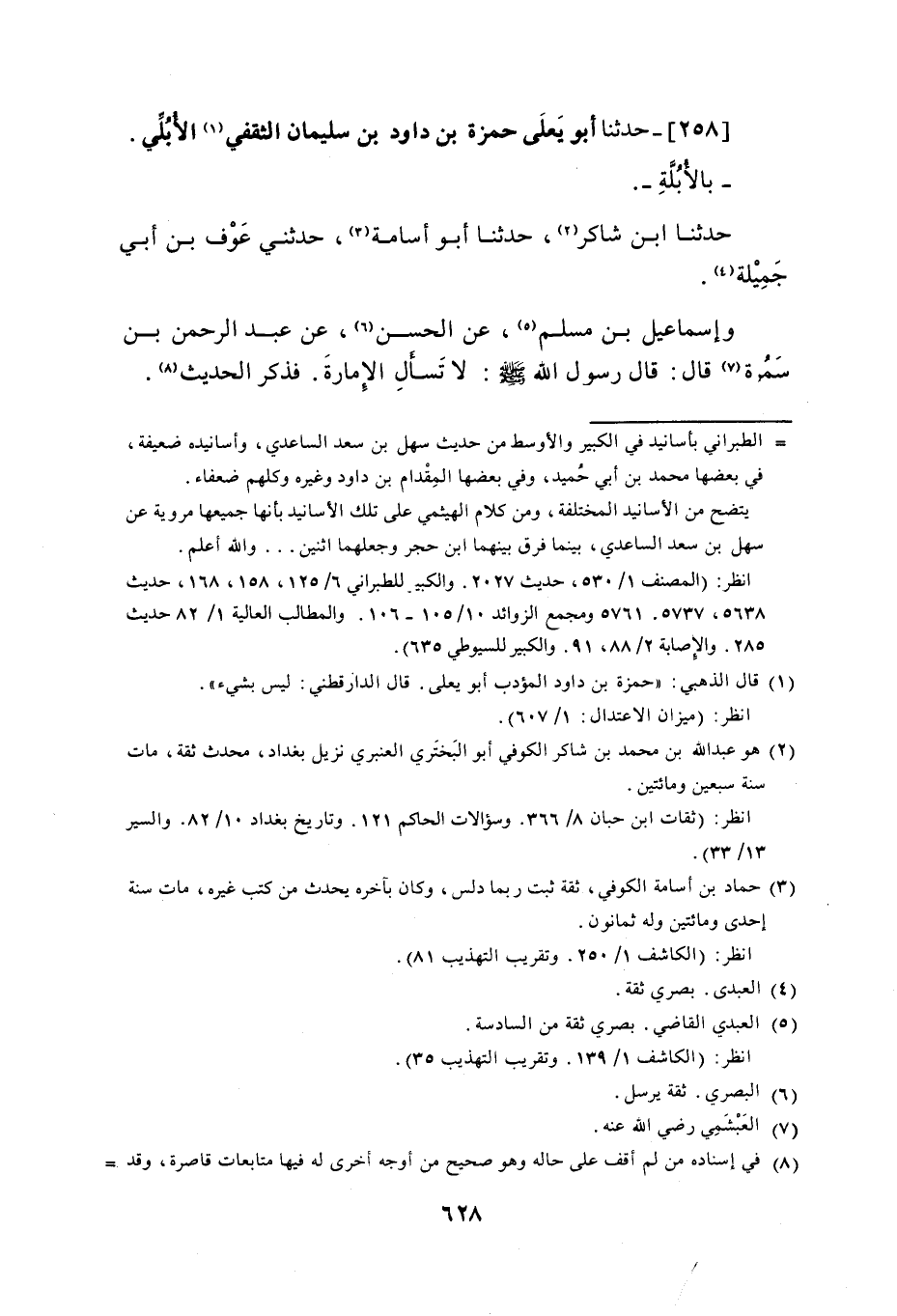 258 - حَدَّثَنَا أَبُو يَعْلَى حَمْزَةُ بْنُ دَاوُدَ بْنِ سُلَيْمَانَ الثَّقَفِيُّ الْأُبُلِّيُّ بِالْأُبُلَّةِ حَدَّثَنَا ابْنُ شَاكِرٍ، حَدَّثَنَا أَبُو أُسَامَةَ، حَدَّثَنِي عَوْفُ بْنُ أَبِي جَمِيلَةَ، وَإِسْمَاعِيلُ بْنُ مُسْلِمٍ، عَنِ الْحَسَنِ، عَنْ عَبْدِ الرَّحْمَنِ بْنِ سَمُرَةَ، قَالَ: قَالَ رَسُولُ اللَّهِ صَلَّى اللهُ عَلَيْهِ وَسَلَّمَ: «لَا تَسْأَلِ الْإِمَارَةَ» فَذَكَرَ الْحَدِيثَ