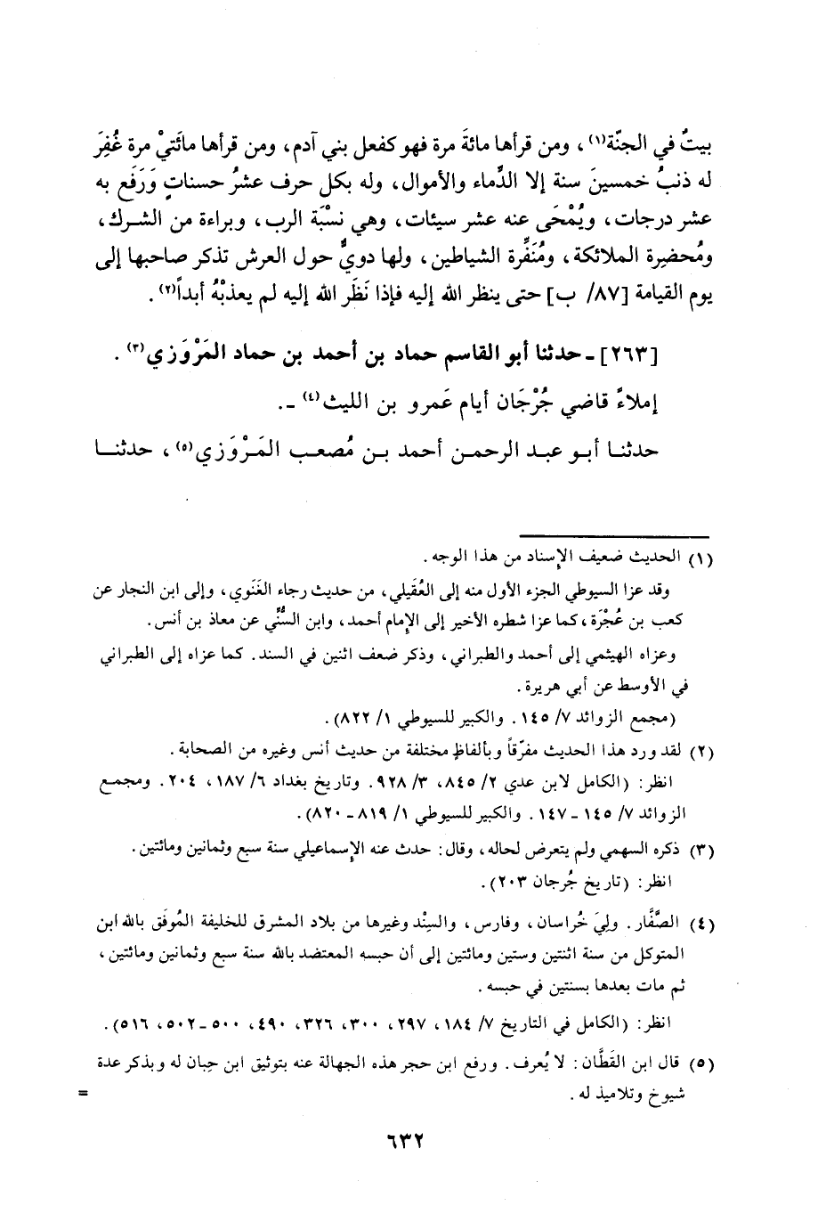 263 - حَدَّثَنَا أَبُو الْقَاسِمِ حَمَّادُ بْنُ أَحْمَدَ بْنِ حَمَّادٍ الْمَرْوَزِيُّ إِمْلَاءً، قَاضِي جُرْجَانَ، أَيَّامَ عَمْرِو بْنِ اللَّيْثِ حَدَّثَنَا أَبُو عَبْدِ الرَّحْمَنِ أَحْمَدُ بْنُ مُصْعَبٍ الْمَرْوَزِيُّ، حَدَّثَنَا -[633]- الْجَارُودُ بْنُ يَزِيدَ، عَنْ بَهْزِ بْنِ حَكِيمِ بْنِ مُعَاوِيَةَ، عَنْ أَبِيهِ، عَنْ جَدِّهِ، قَالَ: قَالَ رَسُولُ اللَّهِ صَلَّى اللهُ عَلَيْهِ وَسَلَّمَ: «أَتَرِعُونَ عَنْ ذِكْرِ الْفَاجِرِ، اذْكُرُوهُ بِمَا فِيهِ كَيْ يَعْرِفَهُ النَّاسُ» قَالَ أَبُو عَبْدِ الرَّحْمَنِ: فَقُلْتُ لِلْجَارُودِ: لَمْ يَرْوِ هَذَا الْحَدِيثَ أَحَدٌ غَيْرَكَ، فَقَالَ: عَرَفْتَ قَوْلَ الْحَسَنِ؟ قُلْتُ: وَمَا قَالَ الْحَسَنُ؟ قَالَ: حَدَّثَنَا رَوْحُ بْنُ مُسَافِرٍ، عَنْ يُونُسَ، عَنِ الْحَسَنِ، وَذُكِرَ رَجُلٌ عِنْدَ الْحَسَنِ، فَقَالَ: مَنْ هُوَ؟ فَقِيلَ لَهُ: يَا أَبَا سَعِيدٍ، مَا نَرَاكَ إِلَّا اغْتَبْتَ الرَّجُلَ، فَقَالَ: أَيْ لُكَعُ، هَلْ غِبْتُ مِنْ شَيْءٍ فَيَكُونُ غِيبَةً؟ أَيُّمَا رَجُلٌ أَعْلَنَ بِالْمَعَاصِي وَلَمْ يَكْتُمْهَا النَّاسَ كَانَ ذِكْرُكُمْ إِيَّاهُ حَسَنَةً تُكْتَبُ لَكُمْ، وَأَيُّمَا رَجُلٌ يَعْمَلُ بِالْمَعَاصِي فَكَتَمَهَا النَّاسَ كَانَ ذِكْرُكُمْ إِيَّاهُ غِيبَةً
