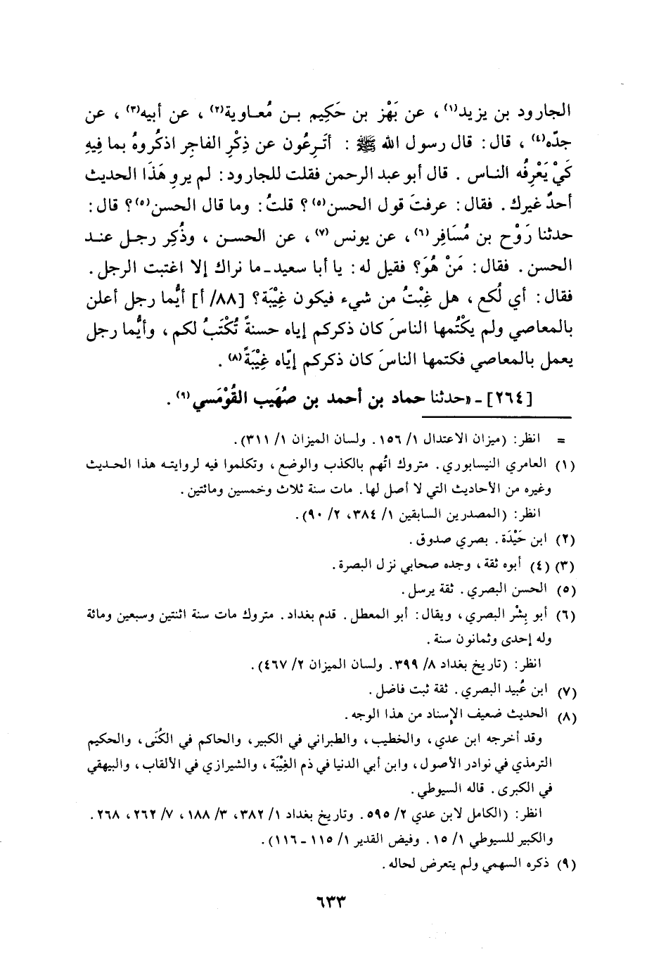 264 - حَدَّثَنَا حَمَّادُ بْنُ أَحْمَدَ بْنِ صُهَيْبٍ الْقُومَسِيُّ -[634]- بِجُرْجَانَ أَبُو عَلِيٍّ إِمْلَاءً حَدَّثَنَا أَبُو خَالِدٍ يَزِيدُ بْنُ سِنَانَ، حَدَّثَنَا مَحْبُوبٌ، حَدَّثَنَا يُونُسُ بْنُ عُبَيْدٍ، عَنِ الْحَسَنِ، عَنْ أَبِي هُرَيْرَةَ، قَالَ: قِيلَ: يَا رَسُولَ اللَّهِ، إِنَّ فُلَانًا بَاتَ الْبَارِحَةَ لَمْ يُصَلِّ حَتَّى أَصْبَحَ، قَالَ: «بَالَ الشَّيْطَانُ فِي أُذُنِهِ»