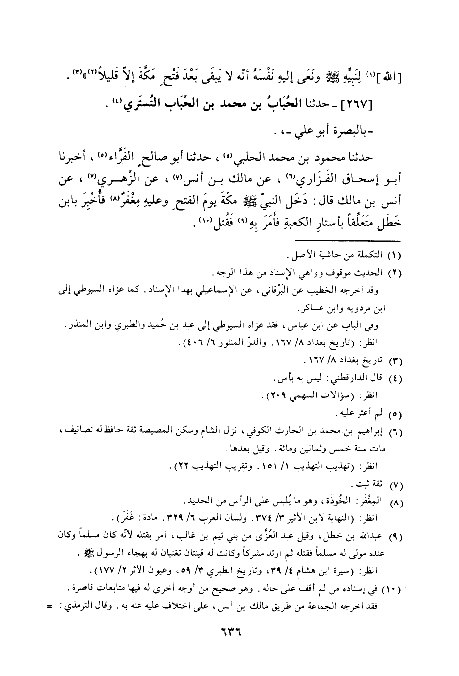 267 - حَدَّثَنَا الْحُبَابُ بْنُ مُحَمَّدِ بْنِ الْحُبَابِ التُّسْتَرِيُّ بِالْبَصْرَةِ أَبُو عَلِيٍّ حَدَّثَنَا مَحْمُودُ بْنُ مُحَمَّدٍ الْحَلَبِيُّ، حَدَّثَنَا أَبُو صَالِحٍ الْفَرَّاءُ، أَخْبَرَنَا أَبُو إِسْحَاقَ الْفَزَارِيُّ، عَنْ مَالِكِ بْنِ أَنَسٍ، عَنِ الزُّهْرِيِّ، عَنْ أَنَسِ بْنِ مَالِكٍ، قَالَ: دَخَلَ النَّبِيُّ صَلَّى اللهُ عَلَيْهِ وَسَلَّمَ مَكَّةَ يَوْمَ الْفَتْحِ وَعَلَيْهِ مِغْفَرٌ، فَأُخْبِرَ بِابْنِ خَطَلٍ مُتَعَلِّقًا بِأَسْتَارِ الْكَعْبَةِ، فَأَمَرَ بِهِ فَقُتِلَ "