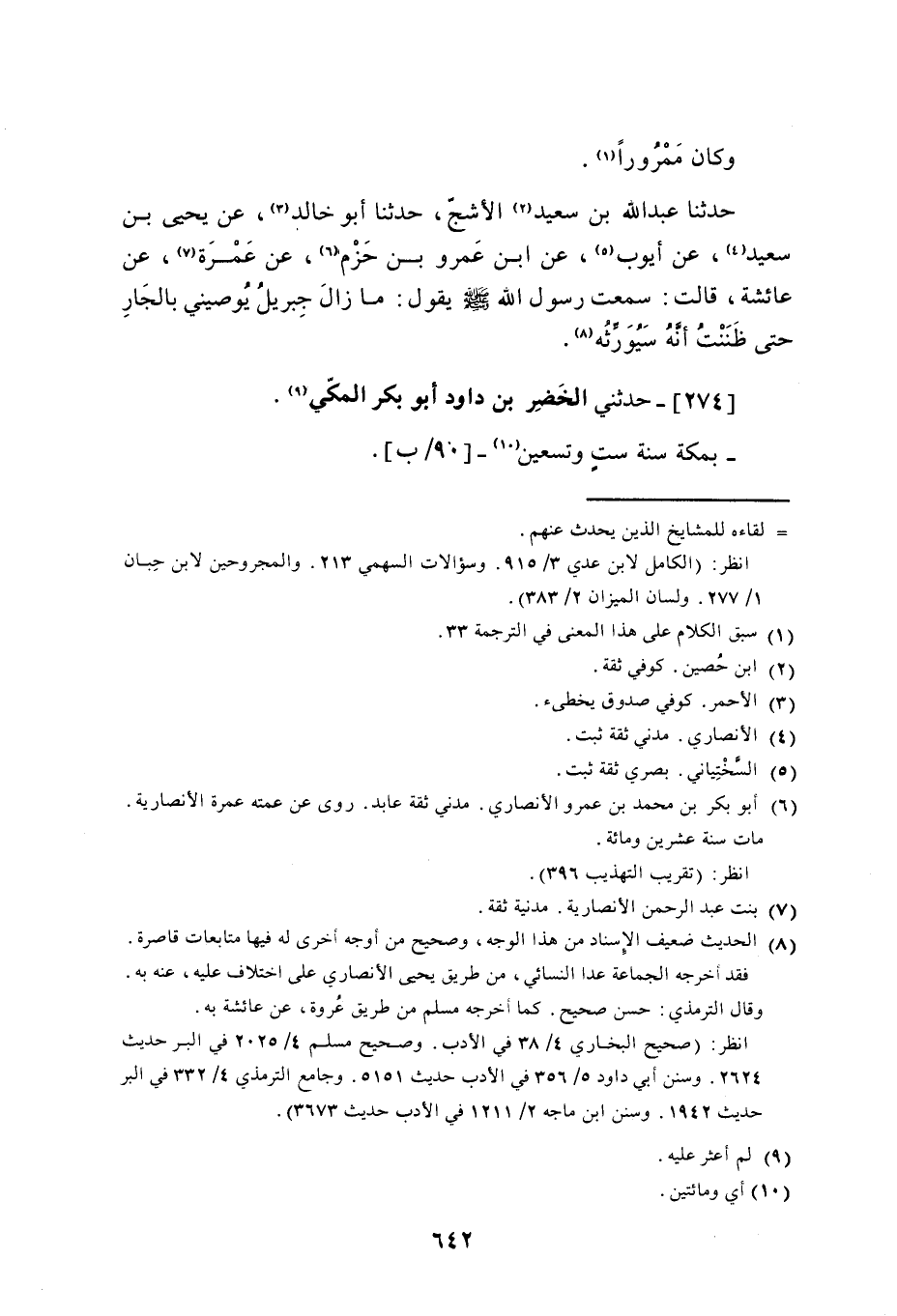 274 - حَدَّثَنِي الْخَضِرُ بْنُ دَاوُدَ أَبُو بَكْرٍ الْمَكِّيُّ بِمَكَّةَ سَنَةَ سِتٍّ وَتِسْعِينَ -[643]- حَدَّثَنَا الْحَسَنُ بْنُ عَرَفَةَ، حَدَّثَنَا قُدَامَةُ بْنُ شِهَابٍ الْمَازِنِيُّ، عَنْ إِسْمَاعِيلَ بْنِ أَبِي خَالِدٍ، عَنْ وَبْرَةَ، عَنِ ابْنِ عُمَرَ، قَالَ: سُئِلَ رَسُولُ اللَّهِ صَلَّى اللهُ عَلَيْهِ وَسَلَّمَ عَنْ أَطْيَبِ الْكَسْبِ، فَقَالَ: «عَمَلُ الرَّجُلِ بِيَدِهِ، وَكُلُّ بَيْعٍ مَبْرُورٌ»