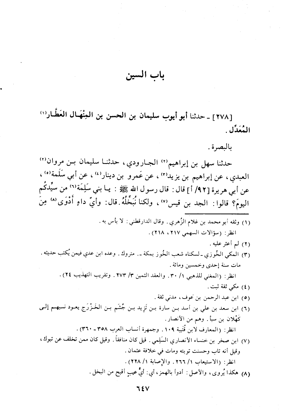 278 - حَدَّثَنَا أَبُو أَيُّوبَ سُلَيْمَانُ بْنُ الْحَسَنِ بْنِ الْمِنْهَالِ الْعَطَّارُ الْمُعَدِّلُ بِالْبَصْرَةِ حَدَّثَنَا سَهْلُ بْنُ إِبْرَاهِيمَ الْجَارُودِيُّ، حَدَّثَنَا سُلَيْمَانُ بْنُ مَرْوَانَ الْعَبْدِيُّ، عَنْ إِبْرَاهِيمَ بْنِ يَزِيدَ، عَنْ عَمْرِو بْنِ دِينَارٍ، عَنْ أَبِي سَلَمَةَ، عَنْ أَبِي هُرَيْرَةَ، قَالَ: قَالَ رَسُولُ اللَّهِ صَلَّى اللهُ عَلَيْهِ وَسَلَّمَ: «يَا بَنِي سَلِمَةَ، مَنْ سَيِّدُكُمُ الْيَوْمَ؟» قَالُوا: الْجَدُّ بْنُ قَيْسٍ، وَلَكِنَّا نُبَخِّلُهُ، قَالَ: «وَأَيُّ دَاءٍ أَدْوَى مِنَ -[648]- الْبُخْلِ، لَكِنْ سَيِّدُكُمْ عَمْرُو بْنُ الْجَمُوحِ»
