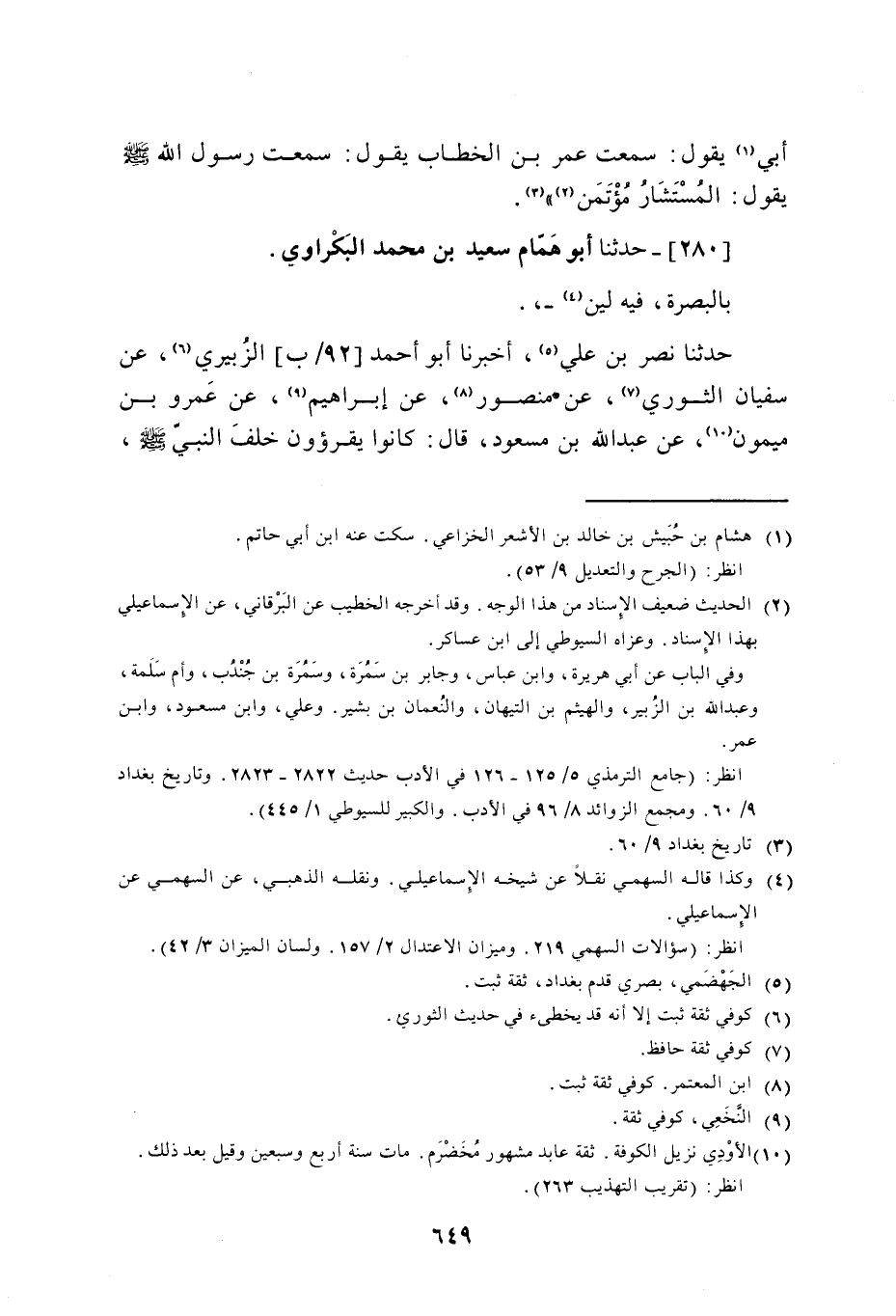280 - حَدَّثَنَا أَبُو هَمَّامٍ سَعِيدُ بْنُ مُحَمَّدٍ الْبَكْرَاوِيُّ بِالْبَصْرَةِ، فِيهِ لِينٌ حَدَّثَنَا نَصْرُ بْنُ عَلِيٍّ، أَخْبَرَنَا أَبُو أَحْمَدَ الزُّبَيْرِيُّ، عَنْ سُفْيَانَ الثَّوْرِيِّ، عَنْ مَنْصُورٍ، عَنْ إِبْرَاهِيمَ، عَنْ عَمْرِو بْنِ مَيْمُونٍ، عَنْ عَبْدِ اللَّهِ بْنِ مَسْعُودٍ، قَالَ: كَانُوا يَقْرَءُونَ خَلْفَ النَّبِيِّ صَلَّى اللهُ عَلَيْهِ وَسَلَّمَ -[650]-، فَقَالَ: «خَلَطْتُمْ عَلَيَّ الْقُرْآنَ»