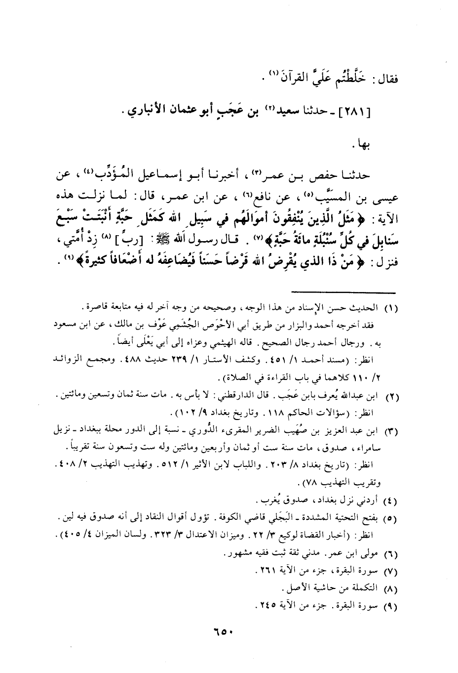 281 - حَدَّثَنَا سَعِيدُ بْنُ عَجَبٍ أَبُو عُثْمَانَ الْأَنْبَارِيُّ بِهَا حَدَّثَنَا حَفْصُ بْنُ عُمَرَ، أَخْبَرَنَا أَبُو إِسْمَاعِيلَ الْمُؤَدِّبُ، عَنْ عِيسَى بْنِ الْمُسَيَّبِ، عَنْ نَافِعٍ، عَنِ ابْنِ عُمَرَ، قَالَ: لَمَّا نَزَلَتْ هَذِهِ الْآيَةُ {مَثَلُ الَّذِينَ يُنْفِقُونَ أَمْوَالَهُمْ فِي سَبِيلِ اللَّهِ كَمَثَلِ حَبَّةٍ أَنْبَتَتْ سَبْعَ سَنَابِلَ فِي كُلِّ سُنْبُلَةٍ مِائَةُ حَبَّةٍ} قَالَ رَسُولُ اللَّهِ صَلَّى اللهُ عَلَيْهِ وَسَلَّمَ: «رَبِّ زِدْ أُمَّتِي»، فَنَزَلَ {مَنْ ذَا الَّذِي يُقْرِضُ اللَّهَ قَرْضًا حَسَنًا فَيُضَاعِفَهُ لَهُ أَضْعَافًا كَثِيرَةً} [البقرة: 245]