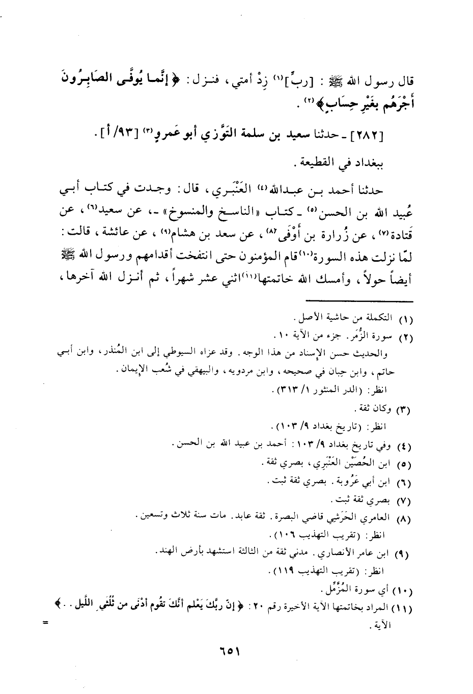 282 - حَدَّثَنَا سَعِيدُ بْنُ سَلَمَةَ التَّوَّزِيُّ أَبُو عَمْرٍو بِبَغْدَادَ فِي الْقَطِيعَةِ حَدَّثَنَا أَحْمَدُ بْنُ عَبْدِ اللَّهِ الْعَنْبَرِيُّ، قَالَ: وَجَدْتُ فِي كِتَابِ أَبِي عُبَيْدِ اللَّهِ بْنِ الْحَسَنِ، كِتَابَ: النَّاسِخُ وَالْمَنْسُوخُ، عَنْ سَعِيدٍ، عَنْ قَتَادَةَ، عَنْ زُرَارَةَ بْنِ أَوْفَى، عَنْ سَعْدِ بْنِ هِشَامٍ، عَنْ عَائِشَةَ قَالَتْ: لَمَّا نَزَلَتْ هَذِهِ السُّورَةُ قَامَ الْمُؤْمِنُونَ حَتَّى انْتَفَخَتْ أَقْدَامُهُمْ، وَرَسُولُ اللَّهِ صَلَّى اللهُ عَلَيْهِ وَسَلَّمَ أَيْضًا حَوْلًا، وَأَمْسَكَ اللَّهُ خَاتِمَتَهَا اثْنَيْ عَشَرَ شَهْرًا، ثُمَّ أَنْزَلَ اللَّهُ آخِرَهَا -[652]-، فَصَارَ قِيَامُ اللَّيْلِ تَطَوُّعًا بَعْدَمَا كَانَ قَدْ فُرِضَ "
