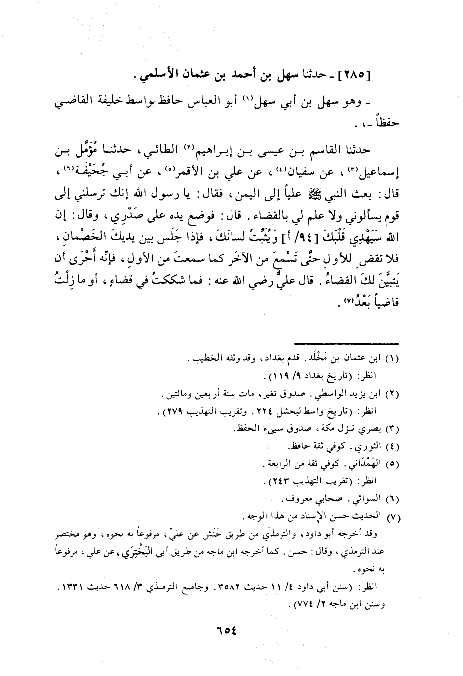 285 - حَدَّثَنَا سَهْلُ بْنُ أَحْمَدَ بْنِ عُثْمَانَ الْأَسْلَمِيُّ وَهُوَ سَهْلُ بْنُ أَبِي سَهْلٍ أَبُو الْعَبَّاسِ حَافَظٌ بِوَاسِطَ خَلِيفَةُ الْقَاضِي حِفْظًا حَدَّثَنَا الْقَاسِمُ بْنُ عِيسَى بْنِ إِبْرَاهِيمَ الطَّائِيُّ، حَدَّثَنَا مُؤَمَّلُ بْنُ إِسْمَاعِيلَ، عَنْ سُفْيَانَ، عَنْ عَلِيِّ بْنِ الْأَقْمَرِ، عَنْ أَبِي جُحَيْفَةَ، قَالَ: بَعَثَ النَّبِيُّ صَلَّى اللهُ عَلَيْهِ وَسَلَّمَ عَلِيًّا إِلَى الْيَمَنِ، فَقَالَ: يَا رَسُولَ اللَّهِ، إِنَّكَ تُرْسِلُنِي إِلَى قَوْمٍ يَسْأَلُونِي وَلَا عِلْمَ لِي بِالْقَضَاءِ، قَالَ: فَوَضَعَ يَدَهُ عَلَى صَدْرِي وَقَالَ: «إِنَّ اللَّهَ سَيَهْدِي قَلْبَكَ، وَيُثَبِّتُ لِسَانَكَ، فَإِذَا جَلَسَ بَيْنَ يَدَيْكَ الْخَصْمَانِ، فَلَا تَقْضِ لِلْأَوَّلِ حَتَّى تَسْمَعَ مِنَ الْآخَرِ كَمَا سَمِعْتَ مِنَ الْأَوَّلِ؛ فَإِنَّهُ أَحْرَى أَنْ يَتَبَيَّنَ لَكَ الْقَضَاءُ»، قَالَ عَلِيٌّ رَضِيَ اللَّهُ عَنْهُ: فَمَا شَكَكْتُ فِي قَضَاءٍ، أَوْ مَا زِلْتُ قَاضِيًا بَعْدُ