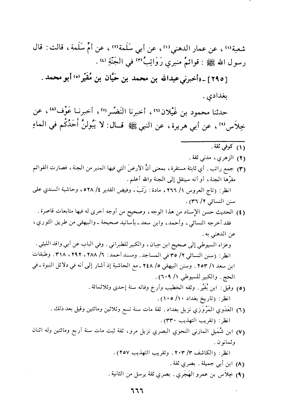 295 - أَخْبَرَنِي عَبْدُ اللَّهِ بْنُ مُحَمَّدِ بْنِ حَيَّانَ بْنِ مُقَيَّرٍ أَبُو مُحَمَّدٍ بَغْدَادِيٌّ حَدَّثَنَا مَحْمُودُ بْنُ غَيْلَانَ، أَخْبَرَنَا النَّضْرُ، أَخْبَرَنَا عَوْفٌ، عَنْ خِلَاسٍ، عَنْ أَبِي هُرَيْرَةَ، عَنِ النَّبِيِّ صَلَّى اللهُ عَلَيْهِ وَسَلَّمَ قَالَ: «لَا يَبُولَنَّ أَحَدُكُمْ فِي الْمَاءِ -[667]- الدَّائِمِ ثُمَّ يَتَوَضَّأُ مِنْهُ» وَقَالَ مُحَمَّدٌ: عَنْ أَبِي هُرَيْرَةَ، عَنِ النَّبِيِّ مِثْلَهُ