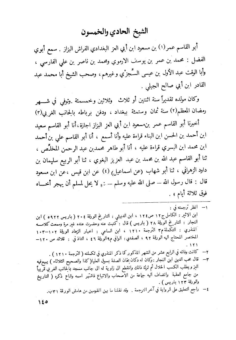 العكبري، أنا أبو الحسن محمد بن أحمد بن رزقويه، ثنا أبو عمرو عثمان ابن أحمد بن عبد الله الدقاق، ثنا محمد بن أحمد بن البراء، ثنا علي بن عبد الله المديني، ثنا يحيى بن سعيد العطار، ثنا عبيد الله بن عمر، ثنا نافع عن ابن عمر، عن النبي - صلى الله عليه وسلم – {يوم يقوم الناس لرب العالمين} : قال: ((يقوم أحدهم في رشحه أنصاف أذنيه)) .