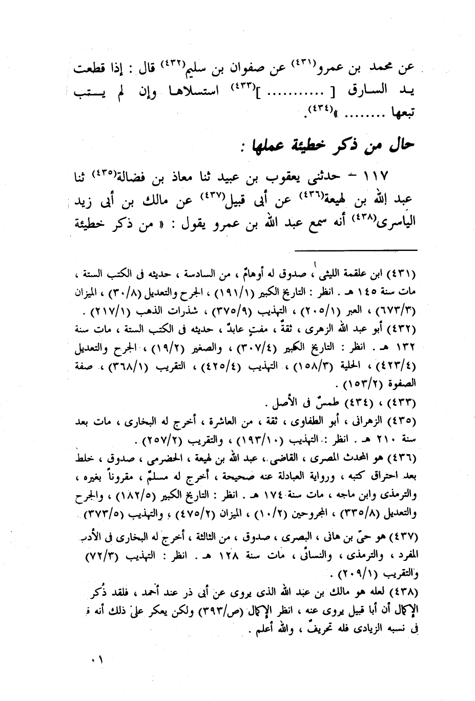 117 - حَدَّثَنِي يَعْقُوبُ بْنُ عُبَيْدٍ، ثنا مُعَاذُ بْنُ فَضَالَةَ، ثنا عَبْدُ اللَّهِ بْنُ لَهِيعَةَ، عَنْ أَبِي قَبِيلٍ، عَنْ مَالِكِ بْنِ أَبِي زَيْدٍ الْيَاسِرِيِّ، أَنَّهُ سَمِعَ عَبْدَ اللَّهِ بْنَ عَمْرٍو، يَقُولُ: §مَنْ ذَكَرَ خَطِيئَةً -[102]- عَمِلَهَا فَوَجِلَ قَلْبُهُ مِنْهَا فَاسْتَغْفَرَ اللَّهَ لَمْ يَحْسِبْهَا شَيْئًا حَتَّى يَمْحَاهَا