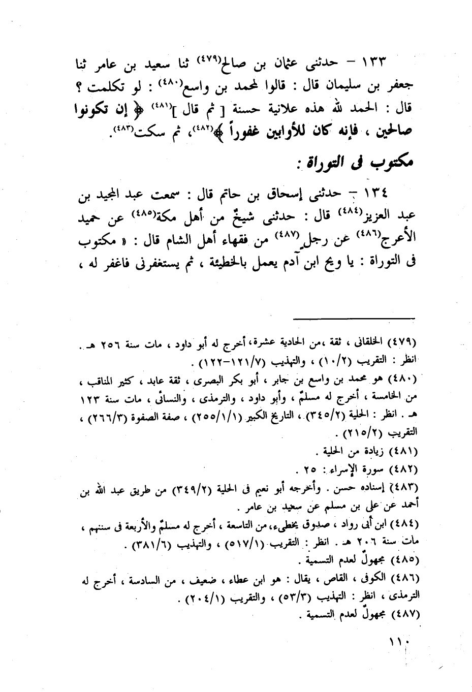 134 - حَدَّثَنِي إِسْحَاقُ بْنُ حَاتِمٍ، قَالَ: سَمِعْتُ عَبْدَ الْمَجِيدِ بْنَ عَبْدِ الْعَزِيزِ، قَالَ: حَدَّثَنِي شَيْخٌ، مِنْ أَهْلِ مَكَّةَ، عَنْ حُمَيْدٍ الْأَعْرَجِ، عَنْ رَجُلٍ، مِنْ فُقَهَاءِ أَهْلِ الشَّامِ قَالَ: مَكْتُوبٌ فِي التَّوْرَاةِ: §يَا وَيْحَ ابْنِ آدَمَ يَعْمَلُ بِالْخَطِيئَةِ، ثُمَّ يَسْتَغْفِرُنِي فَأَغْفِرُ لَهُ، ثُمَّ يَعُودُ لَهَا، ثُمَّ يَسْتَغْفِرُ فَأَغْفِرُ لَهُ، -[111]- ثُمَّ يَعُودُ لَهَا فَيَسْتَغْفِرُنِي فَأَغْفِرُ لَهُ، يَا وَيْحَ ابْنِ آدَمَ لَا يُرِيدُ تَرْكَ عَمَلٍ بِالْخَطِيئَةِ، وَلَا يَيْأَسُ مِنْ رَحْمَتِي فَقَدْ غَفَرْتُ لَهُ، فَقَدْ غَفَرْتُ لَهُ، فَقَدْ غَفَرْتُ لَهُ "