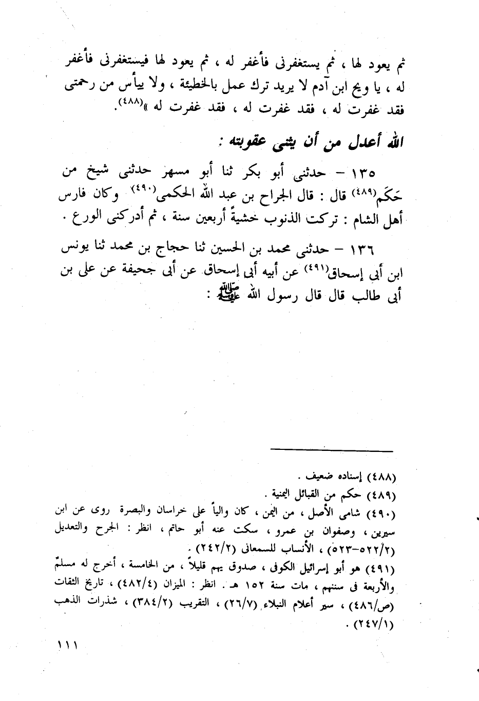 136 - حَدَّثَنِي مُحَمَّدُ بْنُ الْحُسَيْنِ، ثنا حَجَّاجُ بْنُ مُحَمَّدٍ، ثنا يُونُسُ بْنُ أَبِي إِسْحَاقَ، عَنْ أَبِيهِ أَبِي إِسْحَاقَ، عَنْ أَبِي جُحَيْفَةَ، عَنْ عَلِيِّ بْنِ أَبِي طَالِبٍ، قَالَ: قَالَ رَسُولُ اللَّهِ صَلَّى اللهُ عَلَيْهِ وَسَلَّمَ: -[112]- «§مَنْ أَصَابَ فِي الدُّنْيَا ذَنْبًا فَعُوقِبَ بِهِ، فَاللَّهُ أَعْدَلُ مِنْ أَنْ يُثَنِّي عُقُوبَتَهُ عَلَى عَبْدِهِ، وَمَنْ أَذْنَبَ ذَنْبًا فِي الدُّنْيَا فَسُتِرَ عَلَيْهِ فَاللَّهُ أَكْرَمُ مِنْ أَنْ يَعُودَ فِي شَيْءٍ قَدْ عَفَا عَنْهُ»