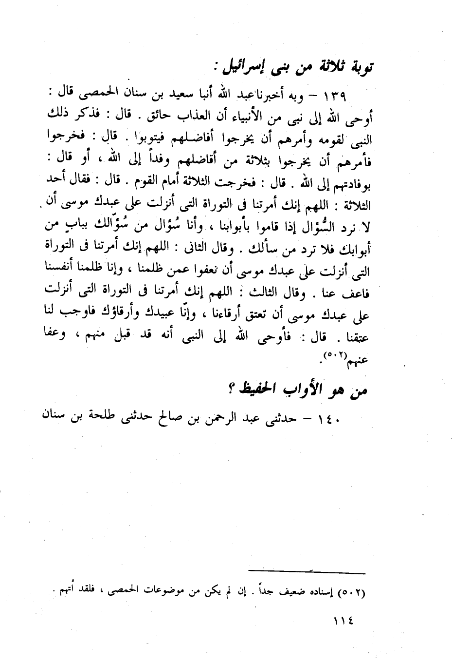 139 - وَبِهِ أَخْبَرَنَا عَبْدُ اللَّهِ، أنبا سَعِيدُ بْنُ سِنَانٍ الْحِمْصِيُّ، قَالَ: §أَوْحَى اللَّهُ إِلَى نَبِيٍّ مِنَ الْأَنْبِيَاءِ أَنَّ الْعَذَابَ حَائِقٌ، قَالَ: فَذَكَرَ ذَلِكَ النَّبِيُّ لِقَوْمِهِ وَأَمَرَهُمْ أَنْ يُخْرِجُوا أَفَاضِلَهُمْ فَيَتُوبُوا، قَالَ: فَخَرَجُوا فَأَمَرَهُمْ أَنْ يَخْرُجُوا بِثَلَاثَةٍ مِنْ أَفَاضِلِهِمْ وَفْدًا إِلَى اللَّهِ، أَوْ قَالَ: بِوِفَادَتِهِمْ إِلَى اللَّهِ، قَالَ: فَخَرَجَتِ الثَّلَاثَةُ أَمَامَ الْقَوْمِ قَالَ: فَقَالَ أَحَدُ الثَّلَاثَةِ: اللَّهُمَّ إِنَّكَ أَمَرْتَنَا فِي التَّوْرَاةِ الَّتِي أَنْزَلْتَ عَلَى عَبْدِكَ مُوسَى أَنْ لَا نَرُدَّ السُّؤَالَ إِذَا قَامُوا بِأَبْوَابِنَا، وَإِنَّا سُؤَّالٌ مِنْ سُؤَّالِكَ بِبَابٍ مِنْ أَبْوَابِكَ فَلَا تَرُدَّ مَنْ سَأَلَكَ، وَقَالَ الثَّانِي: اللَّهُمَّ إِنَّكَ أَمَرْتَنَا فِي التَّوْرَاةِ الَّتِي أُنْزِلَتْ عَلَى عَبْدِكَ مُوسَى أَنْ نَعْفُوَ عَمَّنْ ظَلَمْنَا، وَإِنَّا ظَلَمْنَا أَنْفُسَنَا فَاعْفُ عَنَّا، وَقَالَ الثَّالِثُ: اللَّهُمَّ إِنَّكَ أَمَرْتَنَا فِي التَّوْرَاةِ الَّتِي أَنْزَلْتَ عَلَى عَبْدِكَ مُوسَى أَنْ نُعْتِقَ أَرِقَّاءَنَا، وَإِنَّا عُبَيْدُكَ وَأَرِقَّاؤُكَ فَأَوْجِبْ لَنَا عِتْقَنَا، قَالَ: فَأَوْحَى إِلَى النَّبِيِّ أَنَّهُ قَدْ قَبِلَ مِنْهُمْ، وَعَفَا عَنْهُمْ