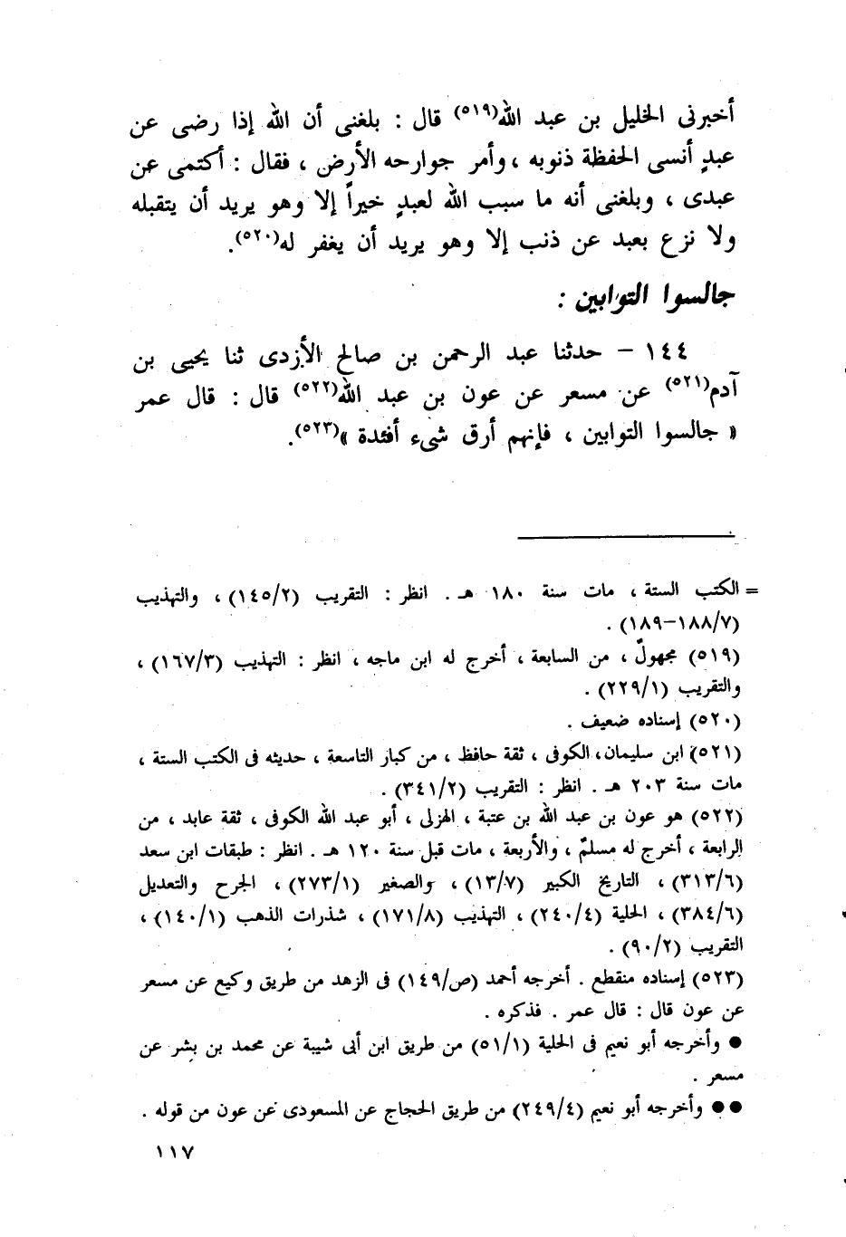 144 - حَدَّثَنَا عَبْدُ الرَّحْمَنِ بْنُ صَالِحٍ الْأَزْدِيُّ، ثنا يَحْيَى بْنُ آدَمَ، عَنْ مِسْعَرٍ، عَنْ عَوْنِ بْنِ عَبْدِ اللَّهِ، قَالَ: قَالَ عُمَرُ: «§جَالِسُوا التَّوَّابِينَ، فَإِنَّهُمْ أَرَقُّ شَيْءٍ أَفْئِدَةً»