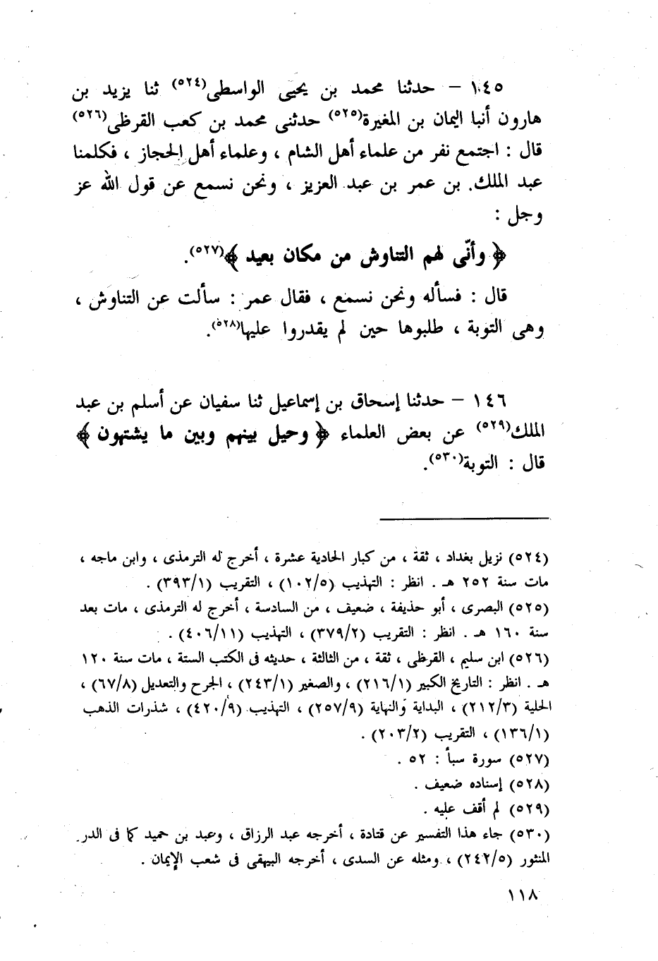 145 - حَدَّثَنَا مُحَمَّدُ بْنُ يَحْيَى الْوَاسِطِيُّ، ثنا يَزِيدُ بْنُ هَارُونَ، أنبا الْيَمَانُ بْنُ الْمُغِيرَةِ، حَدَّثَنِي مُحَمَّدُ بْنُ كَعْبٍ الْقُرَظِيُّ، قَالَ: اجْتَمَعَ نَفَرٌ مِنْ عُلَمَاءِ أَهْلِ الشَّامِ، وَعُلَمَاءِ أَهْلِ الْحِجَازِ، فَكَلَّمَنَا عَبْدُ الْمَلِكِ بْنُ عُمَرَ بْنِ عَبْدِ الْعَزِيزِ، وَنَحْنُ نَسْمَعُ عَنْ قَوْلِ اللَّهِ عَزَّ وَجَلَّ: {وَأَنَّى لَهُمُ التَّنَاوُشُ مِنْ مَكَانٍ بَعِيدٍ} [سبأ: 52] قَالَ: فَسَأَلَهُ وَنَحْنُ نَسْمَعُ، فَقَالَ عُمَرُ: «§سَأَلْتَ عَنِ التَّنَاوُشِ، وَهِيَ التَّوْبَةُ، طَلَبُوهَا حِينَ لَمْ يَقْدِرُوا عَلَيْهَا»