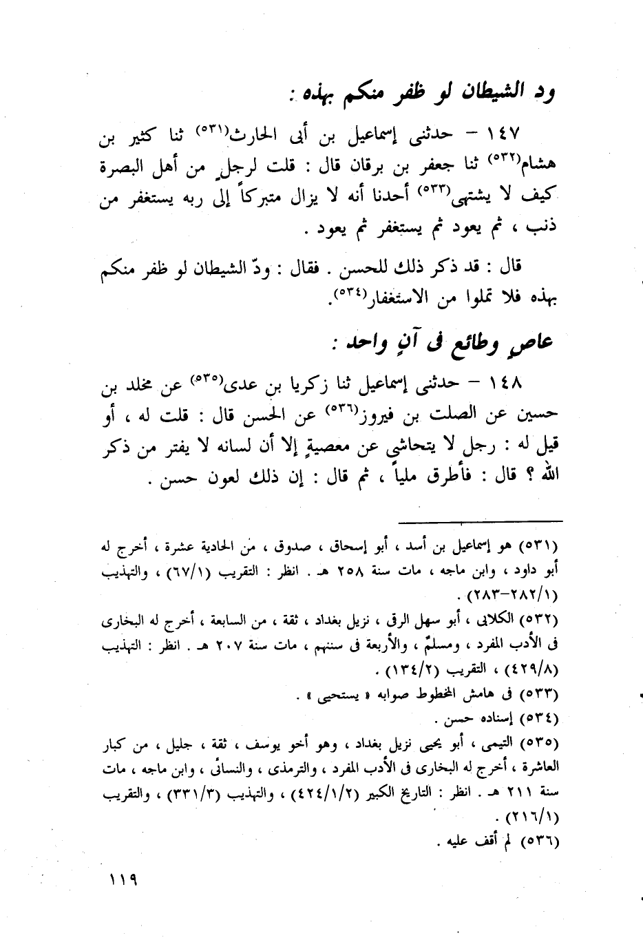 147 - حَدَّثَنِي إِسْمَاعِيلُ بْنُ أَبِي الْحَارِثِ، ثنا كَثِيرُ بْنُ هِشَامٍ، ثنا جَعْفَرُ بْنُ بُرْقَانَ، قَالَ: قُلْتُ لِرَجُلٍ مِنْ أَهْلِ الْبَصْرَةِ: §كَيْفَ لَا يَشْتَهِي أَحَدُنَا أَنَّهُ لَا يَزَالُ مُتَبَرِّكًا إِلَى رَبِّهِ يَسْتَغْفِرُ مِنْ ذَنْبٍ، ثُمَّ يَعُودُ ثُمَّ يَسْتَغْفِرُ ثُمَّ يَعُودُ، قَالَ: قَدْ ذُكِرَ لِلْحَسَنِ، فَقَالَ: «وَدَّ الشَّيْطَانُ لَوْ ظَفِرَ مِنْكُمْ بِهَذِهِ فَلَا تَمَلُّوا مِنَ الِاسْتِغْفَارِ»