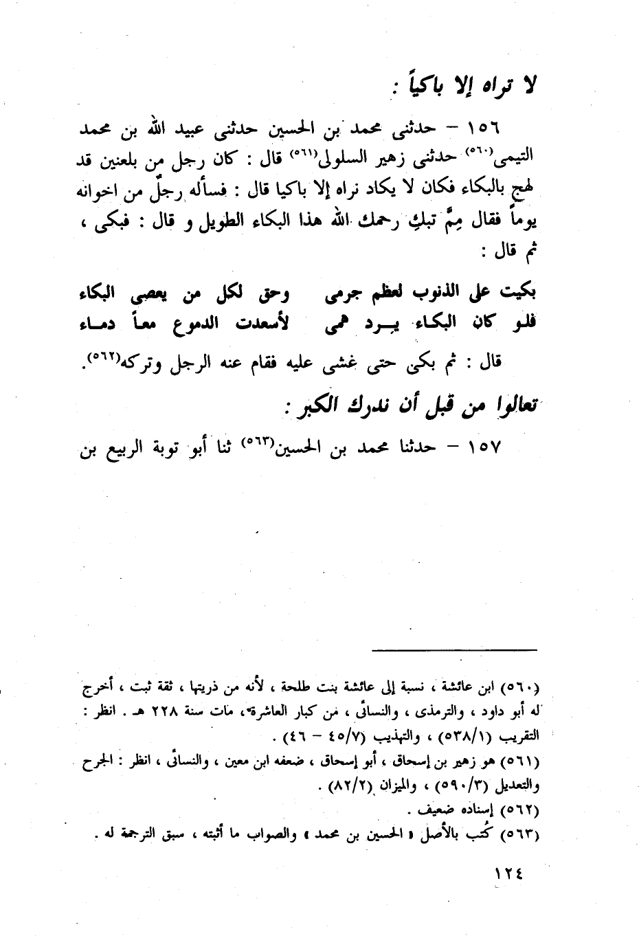 156 - حَدَّثَنِي مُحَمَّدُ بْنُ الْحُسَيْنِ، حَدَّثَنِي عُبَيْدُ اللَّهِ بْنُ مُحَمَّدٍ التَّيْمِيُّ، حَدَّثَنِي زُهَيْرٌ السَّلُولِيُّ، قَالَ: كَانَ رَجُلٌ مِنْ بَلْعَنِينِ قَدْ لَهَجَ بِالْبُكَاءِ فَكَانَ لَا يَكَادُ نَرَاهُ إِلَّا بَاكِيًا قَالَ: فَسَأَلَهُ رَجُلٌ مِنْ إِخْوَانِهِ يَوْمًا فَقَالَ: §مِمَّ تَبْكِي رَحِمَكَ اللَّهُ هَذَا الْبُكَاءُ الطَّوِيلُ؟ وَقَالَ: فَبَكَى، ثُمَّ قَالَ: