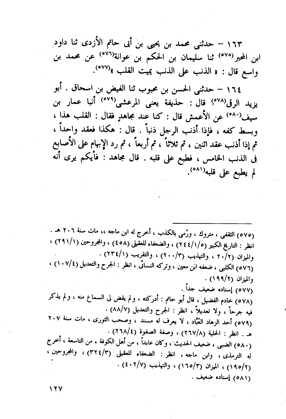 164 - حَدَّثَنِي الْحَسَنُ بْنُ مَحْبُوبٍ، ثنا الْفَيْضُ بْنُ إِسْحَاقَ أَبُو يَزِيدَ الرَّقَّيُّ، قَالَ حُذَيْفَةُ يَعْنِي الْمَرْعَشِيَّ، أنبا عَمَّارُ بْنُ سَيْفٍ، عَنِ الْأَعْمَشِ، قَالَ: كُنَّا عِنْدَ مُجَاهِدٍ فَقَالَ: §الْقَلْبُ هَذَا وَبَسَطَ كَفَّهُ، فَإِذَا أَذْنَبَ الرَّجُلُ ذَنْبًا، قَالَ: هَكَذَا فَعَقَدَ وَاحِدًا، ثُمَّ إِذَا أَذْنَبَ عَقَدَ اثْنَيْنِ، ثُمَّ ثَلَاثًا، ثُمَّ أَرْبَعًا، ثُمَّ رَدَّ الْإِبْهَامَ عَلَى الْأَصَابِعِ فِي الذَّنْبِ الْخَامِسِ، فَطُبِعَ عَلَى قَلْبِهِ، قَالَ مُجَاهِدٌ: فَأَيُّكُمْ يَرَى أَنَّهُ لَمْ يُطْبَعْ عَلَى قَلْبِهِ؟