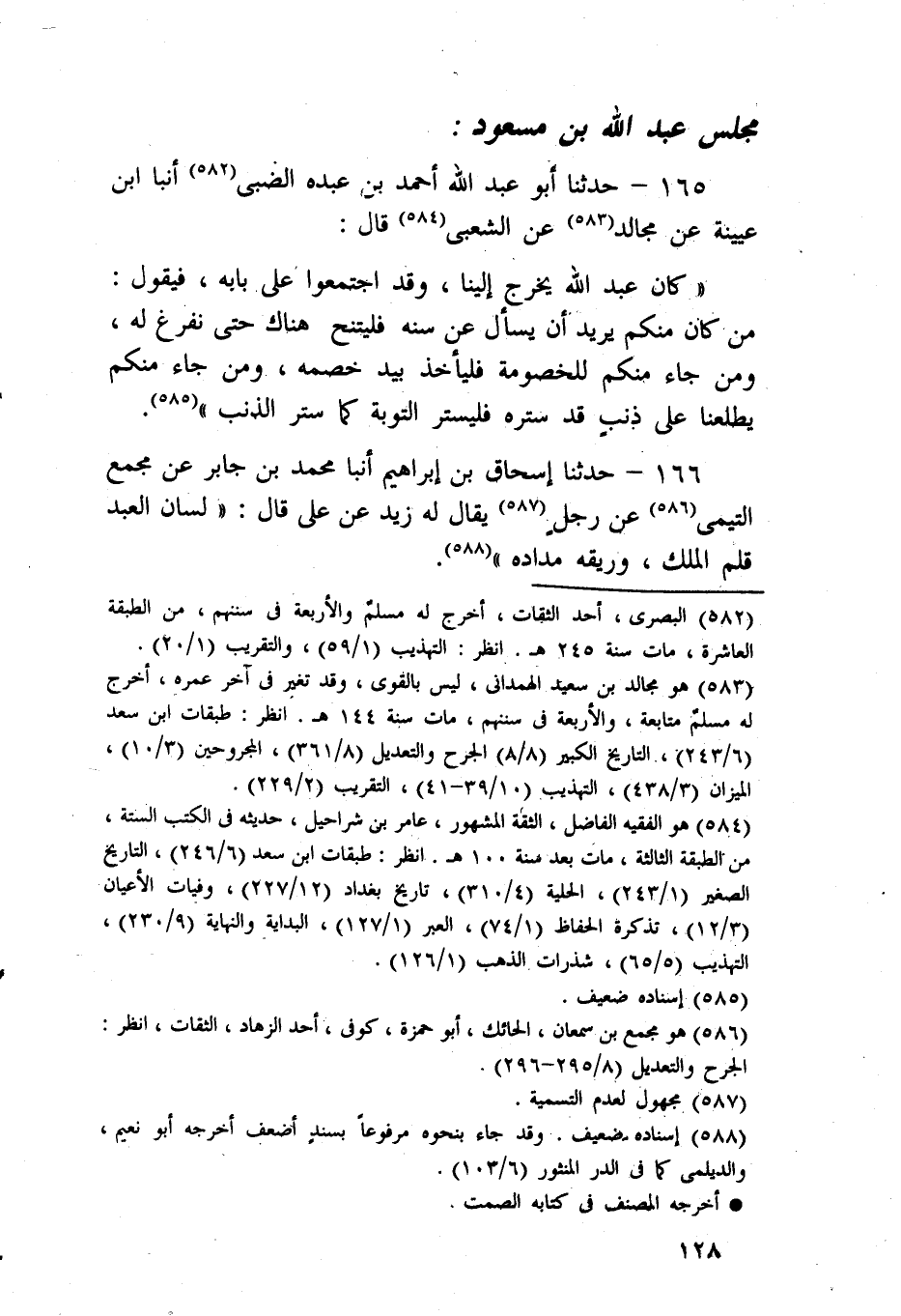 165 - حَدَّثَنَا أَبُو عَبْدِ اللَّهِ أَحْمَدُ بْنُ عَبْدَةَ الضَّبِّيُّ، أنبا ابْنُ عُيَيْنَةَ، عَنْ مُجَالِدٍ، عَنِ الشَّعْبِيِّ، قَالَ: كَانَ عَبْدُ اللَّهِ يَخْرُجُ إِلَيْنَا، وَقَدِ اجْتَمَعُوا عَلَى بَابِهِ، فَيَقُولُ: «§مَنْ كَانَ مِنْكُمْ يُرِيدُ أَنْ يَسْأَلَ عَنْ سُنَّةٍ فَلْيَتَنَحَّ هُنَاكَ حَتَّى نَفْرُغَ لَهُ، وَمَنْ جَاءَ مِنْكُمْ لِلْخُصُومَةِ فَلْيَأْخُذْ بِيَدِ خَصْمِهِ، وَمَنْ جَاءَ مِنْكُمْ يُطْلِعُنَا عَلَى ذَنْبٍ قَدْ سَتَرَهُ اللَّهُ فَلْيَسْتُرِ التَّوْبَةَ كَمَا سَتَرَ الذَّنْبَ»