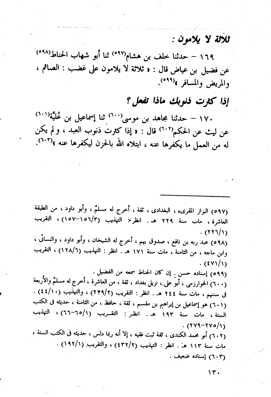 169 - حَدَّثَنَا خَلَفُ بْنُ هِشَامٍ، ثنا أَبُو شِهَابٍ الْحَنَّاطُ، عَنْ فُضَيْلِ بْنِ عِيَاضٍ، قَالَ: " §ثَلَاثَةٌ لَا يُلَامُونَ عَلَى غَضِبٍ: الصَّائِمُ، وَالْمَرِيضُ , وَالْمُسَافِرُ "