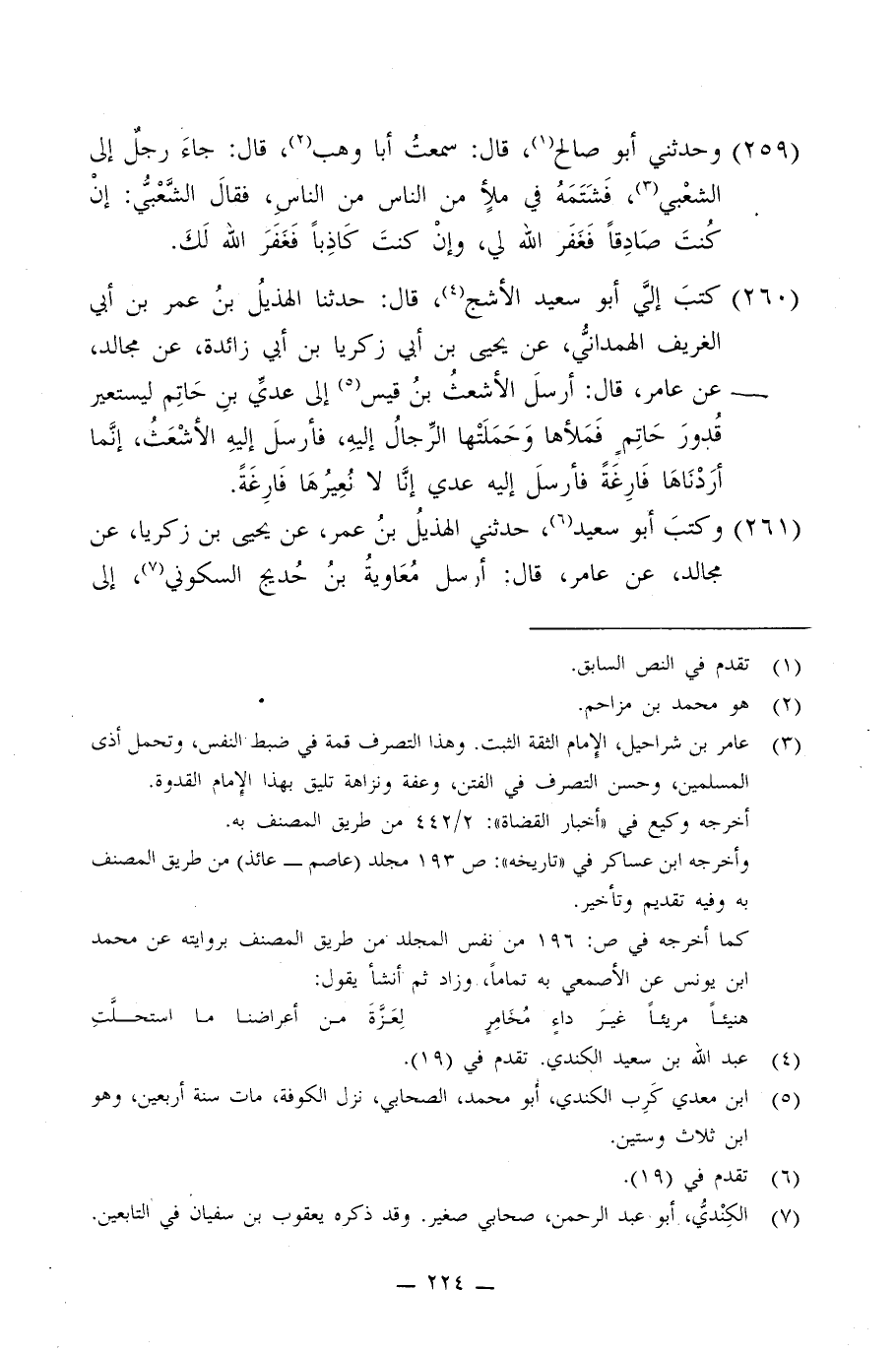 260 - كَتَبَ إِلَيَّ أَبُو سَعِيدٍ الْأَشَجُّ قَالَ: حَدَّثَنَا الْهُذَيْلُ بْنُ عُمَرَ بْنِ أَبِي الْغَرِيفِ الْهَمَذَانِيُّ عَنْ يَحْيَى بْنِ أَبِي زَكَرِيَّا بْنِ أَبِي زَائِدَةَ، عَنْ مُجَالِدٍ، عَنْ عَامِرٍ، قَالَ: §أَرْسَلَ الْأَشْعَثُ بْنُ قَيْسٍ إِلَى عَدِيِّ بْنِ حَاتِمٍ لِيَسْتَعِيرَ قُدُورَ حَاتِمٍ فَمَلَأَهَا وَحَمَلَتْهَا الرِّجَالُ إِلَيْهِ فَأَرْسَلَ إِلَيْهِ الْأَشْعَثُ: إِنَّمَا أَرَدْنَاهَا فَارِغَةً، فَأَرْسَلَ إِلَيْهِ عَدِيٌّ: إِنَّا لَا نُعِيرُهَا فَارِغَةً