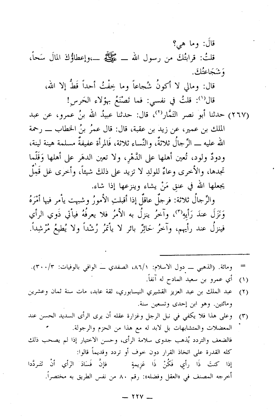 267 - حَدَّثَنَا أَبُو نَصْرٍ التَّمَّارُ، قَالَ: حَدَّثَنَا عُبَيْدُ اللَّهِ بْنُ عَمْرٍو، عَنْ عَبْدِ الْمَلِكِ بْنِ عُمَيْرٍ، عَنْ زَيْدِ بْنِ عُقْبَةَ قَالَ: قَالَ عُمَرُ بْنُ الْخَطَّابِ رَحْمَةُ اللَّهِ عَلَيْهِ: " §الرِّجَالُ ثَلَاثَةٌ وَالنِّسَاءُ ثَلَاثَةٌ: فَامْرَأَةٌ عَفِيفَةٌ مُسَلَّمَةٌ هَيِّنَةٌ لَيِّنَةٌ وَدُودٌ وَلُودٌ تُعِينُ أَهْلَهَا عَلَى الدَّهْرِ وَلَا تُعِينُ الدَّهْرَ عَلَى أَهْلِهَا وَقَلَّمَا تَجِدُهَا، وَالْأُخْرَى وِعَاءٌ لِلْوَلَدِ لَا تَزِيدُ عَلَى ذَلِكَ شَيْئًا , وَأُخْرَى غُلٌّ قَمِلٌ يَجْعَلُهَا اللَّهُ فِي عُنُقِ مَنْ يَشَاءُ وَيَنْزِعُهَا إِذَا شَاءَ، وَالرِّجَالُ ثَلَاثَةٌ: فَرَجُلٌ عَاقِلٌ إِذَا أَقْبَلَتِ الْأُمُورُ وَشَبِهَتْ يَأْمُرُ فِيهَا أَمْرَهُ وَنَزَلَ عِنْدَ رَأْيِهِ، وَآخَرُ يَنْزِلُ بِهِ الْأَمْرُ فَلَا يَعْرِفُهُ فَيَأْتِي ذَوِي الرَّأْيِ فَيَنْزِلُ عِنْدَ رَأْيِهِمْ، وَآخَرُ حَائِرٌ بَائِرٌ لَا يَأْتَمِرُ رُشْدًا وَلَا يُطِيعُ مُرْشِدًا