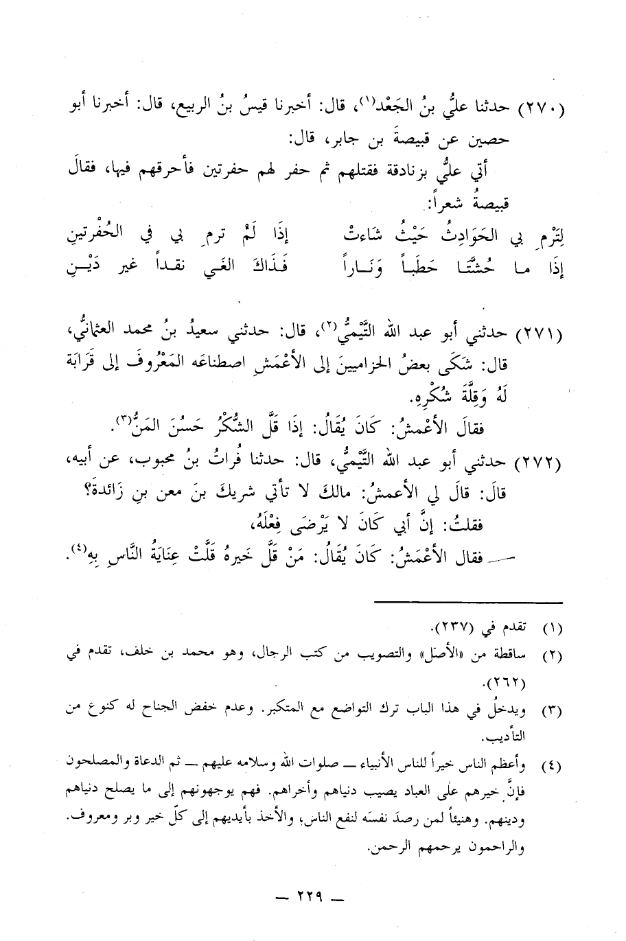 271 - حَدَّثَنِي أَبُو عَبْدِ اللَّهِ التَّيْمِيُّ، قَالَ: حَدَّثَنِي سَعِيدُ بْنُ مُحَمَّدٍ الْعُثْمَانِيُّ، قَالَ: §شَكَى بَعْضُ الْحِزَامِيِّينَ إِلَى الْأَعْمَشِ اصْطِنَاعَهُ الْمَعْرُوفَ إِلَى قَرَابَةٍ لَهُ وَقِلَّةَ شُكْرِهِ، فَقَالَ الْأَعْمَشُ: كَانَ يُقَالُ إِذَا قَلَّ الشُّكْرُ حَسُنَ الْمَنُّ