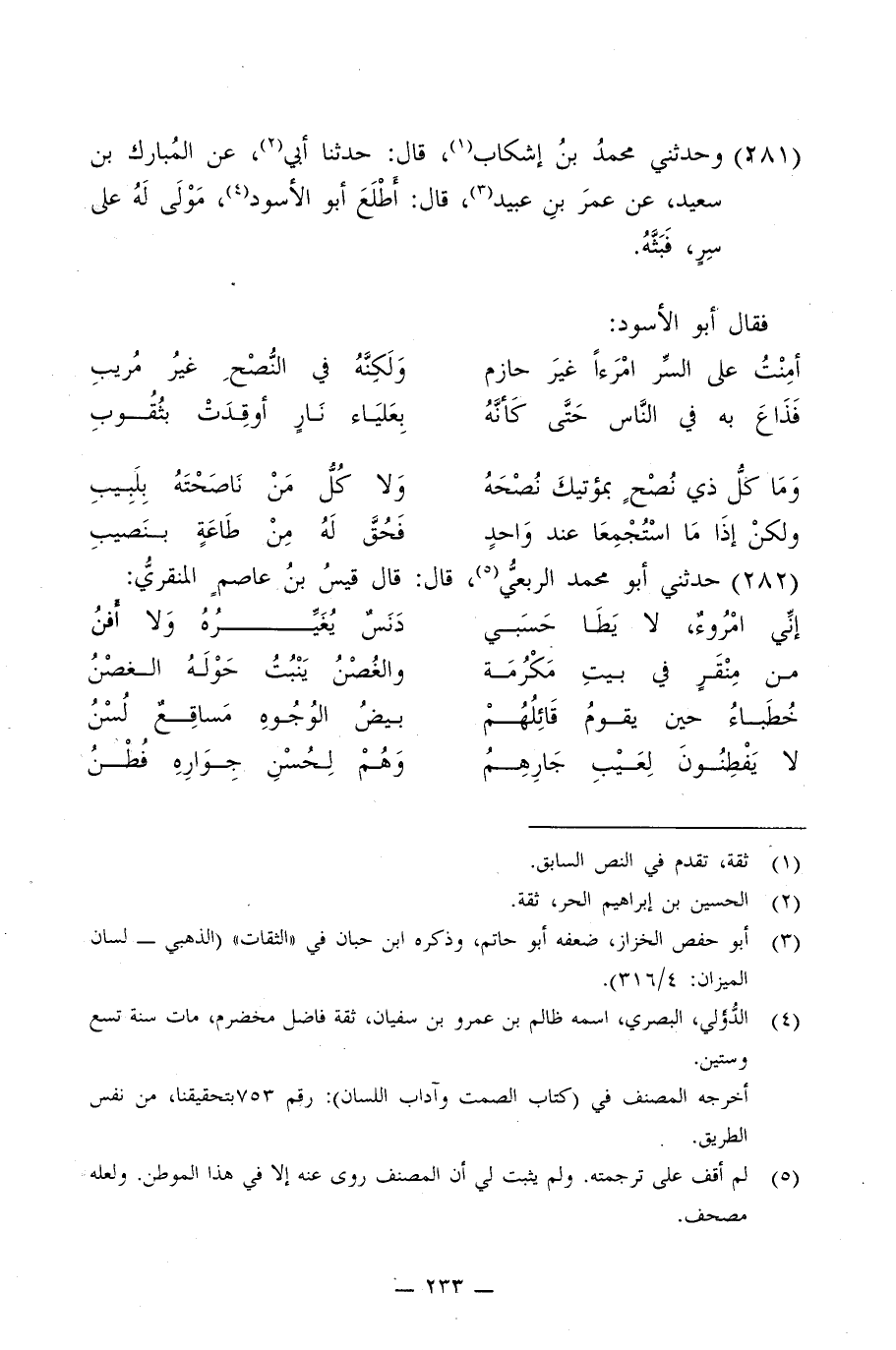 281 - وَحَدَّثَنِي مُحَمَّدُ بْنُ إِشْكَابَ، قَالَ: حَدَّثَنَا أَبِي، عَنِ الْمُبَارَكِ بْنِ سَعِيدٍ، عَنْ عُمَرَ بْنِ عُبَيْدٍ، قَالَ: §أَطْلَعَ أَبُو الْأَسْوَدُ مَوْلًى لَهُ عَلَى سِرٍّ فَبَثَّهُ , فَقَالَ أَبُو الْأَسْوَدِ: