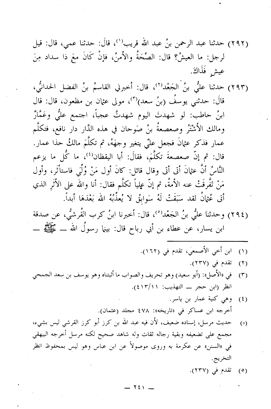 293 - حَدَّثَنَا عَلِيُّ بْنُ الْجَعْدِ، قَالَ: أَخْبَرَنِي الْقَاسِمُ بْنُ الْفَضْلِ الْحُدَّانِيُّ، قَالَ: حَدَّثَنِي يُوسُفُ بْنُ سَعْدٍ مَوْلَى عُثْمَانَ بْنِ مَظْعُونٍ قَالَ: قَالَ ابْنُ حَاطِبٍ: لَوْ شَهِدْتَ الْيَوْمَ شَهِدْتَ عَجَبًا اجْتَمَعَ عَلِيٌّ وَعَمَّارٌ وَمَالِكٌ الْأَشْتَرُ وَصَعْصَعَةُ بْنُ صُوحَانَ فِي هَذِهِ الدَّارِ دَارِ نَافِعٍ - فَتَكَلَّمَ عَمَّارٌ فَذَكَرَ عُثْمَانَ فَجَعَلَ عَلِيٌّ يَتَغَيَّرُ وَجْهُهُ، ثُمَّ تَكَلَّمَ مَالِكٌ حَذَا عَمَّارَ قَالَ: ثُمَّ إِنَّ صَعْصَعَةَ تَكَلَّمَ , فَقَالَ: أَبَا الْيَقْظَانِ مَا كُلُّ مَا يَزْعُمُ النَّاسُ أَنَّ عُثْمَانَ أَتَى وَقَالَ قَائِلٌ: كَانَ أَوَّلَ مَنْ وَلِيَ فَاسْتَأْثَرَ وَأَوَّلَ مَنْ تَفَرَّقَتْ عَنْهُ الْأُمَّةُ، ثُمَّ إِنَّ عَلِيًّا تَكَلَّمَ , فَقَالَ: §أَنَا وَاللَّهِ عَلَى الْأَثَرِ الَّذِي أَتَى عُثْمَانُ لَقَدْ سَبَقَتْ لَهُ سَوَابِقُ لَا يُعَذِّبُهُ اللَّهُ بَعْدَهَا أَبَدًا