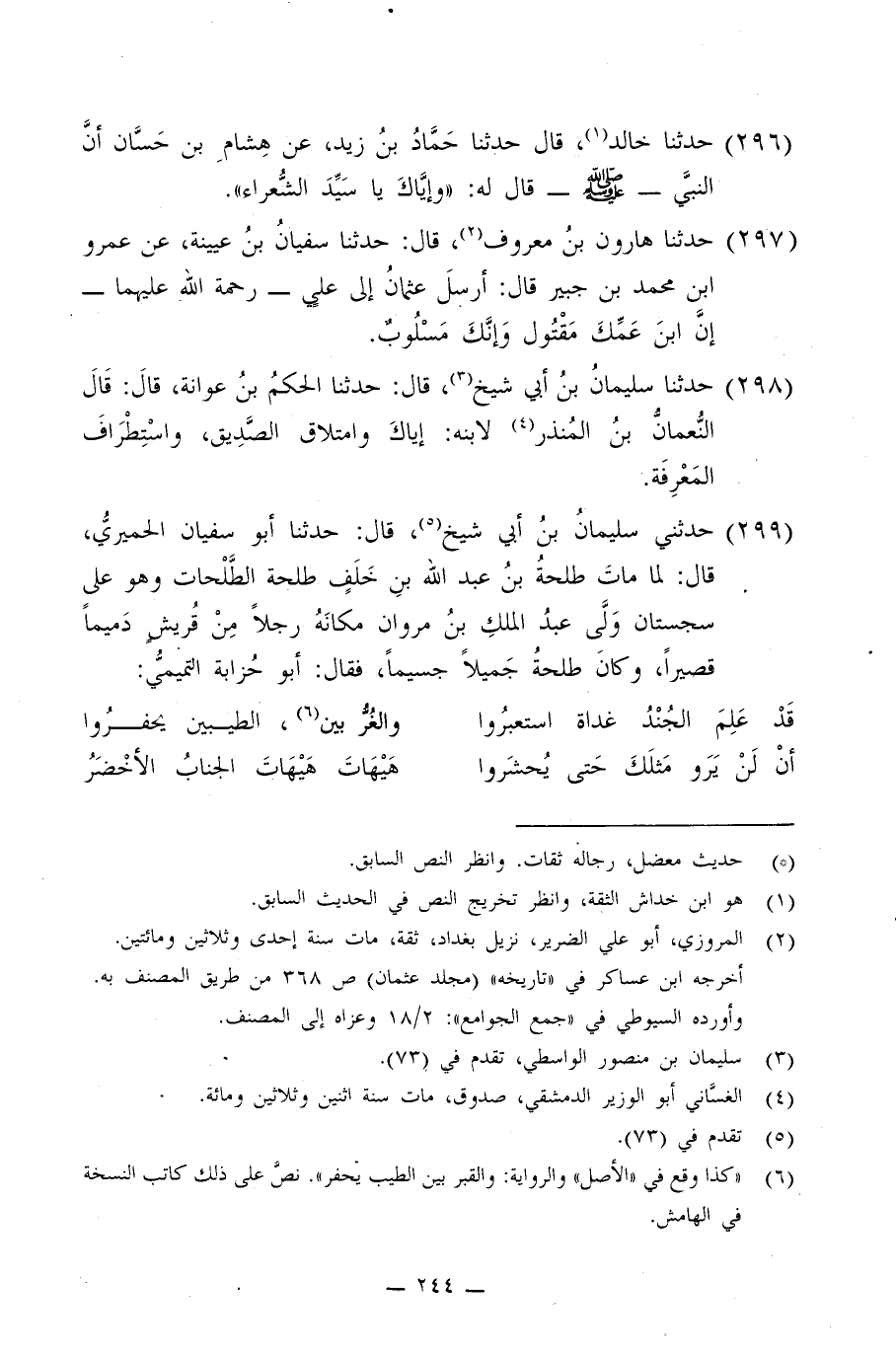 297 - حَدَّثَنَا هَارُونُ بْنُ مَعْرُوفٍ، قَالَ: حَدَّثَنَا سُفْيَانُ بْنُ عُيَيْنَةَ، عَنْ عَمْرِو بْنِ مُحَمَّدٍ، عَنِ ابْنِ جُبَيْرٍ، قَالَ: أَرْسَلَ عُثْمَانُ إِلَى عَلِيٍّ رَحْمَةُ اللَّهِ عَلَيْهِمَا: §إِنَّ ابْنَ عَمِّكَ مَقْتُولٌ وَإِنَّكَ مَسْلُوبٌ