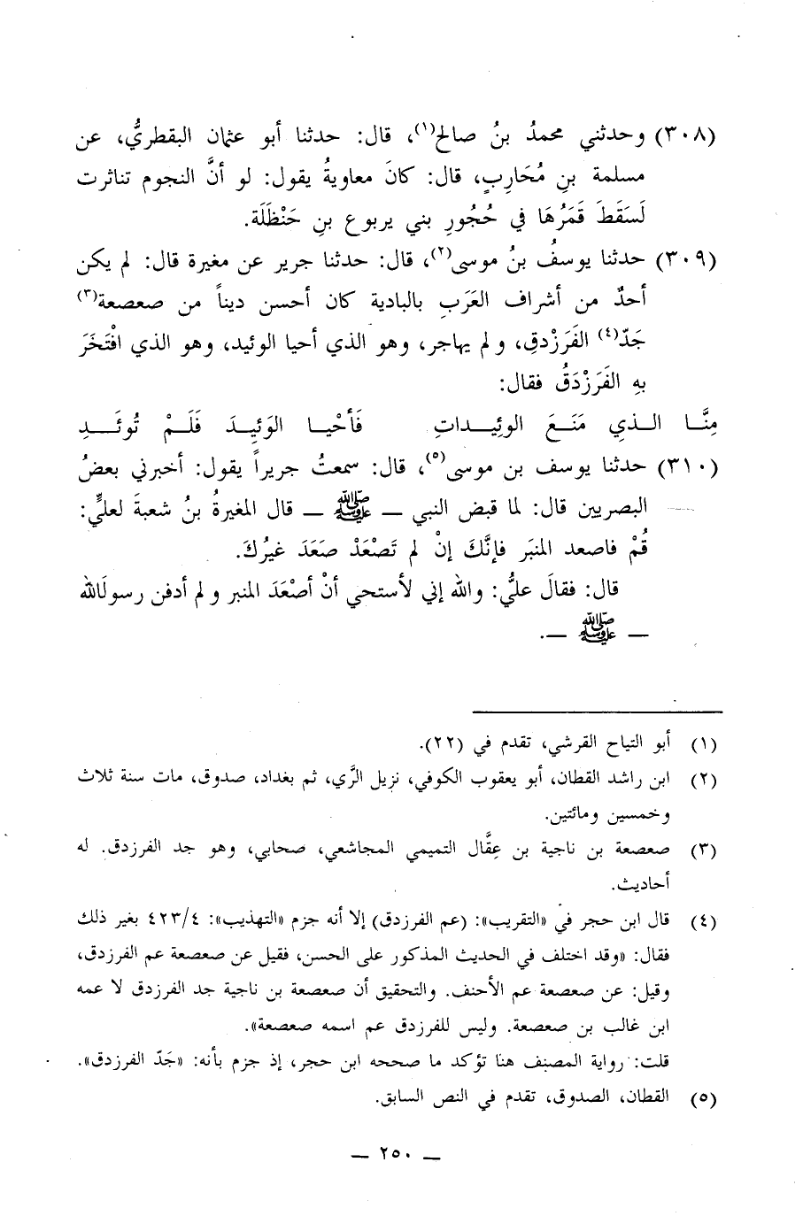 310 - حَدَّثَنَا يُوسُفُ بْنُ مُوسَى، قَالَ: سَمِعْتُ جَرِيرًا، يَقُولُ: أَخْبَرَنِي بَعْضُ الْبَصْرِيِّينَ، قَالَ: §لَمَّا قُبِضَ النَّبِيُّ صَلَّى اللهُ عَلَيْهِ وَسَلَّمَ قَالَ الْمُغِيرَةُ بْنُ شُعْبَةَ لِعَلِيٍّ: قُمْ فَاصْعَدِ الْمِنْبَرَ فَإِنَّكَ إِنْ لَمْ تَصْعَدْ صَعِدَ غَيْرُكَ قَالَ: فَقَالَ عَلِيٌّ: وَاللَّهِ إِنِّي لَأَسْتَحْيِ أَنْ أَصْعَدَ الْمِنْبَرَ وَلَمْ أَدْفِنْ رَسُولَ اللَّهِ صَلَّى اللهُ عَلَيْهِ وَسَلَّمَ -[251]-. قَالَ: فَصَعِدَ غَيْرُهُ. قَالَ: وَقَالَ لَهُ الْمُغِيرَةُ بْنُ شُعْبَةَ حِينَ كَانَتِ الشُّورَى: انْزِعْ نَفْسَكَ مِنْهُمْ فَإِنَّهُمْ لَنْ يُبَايِعُوا غَيْرَكَ