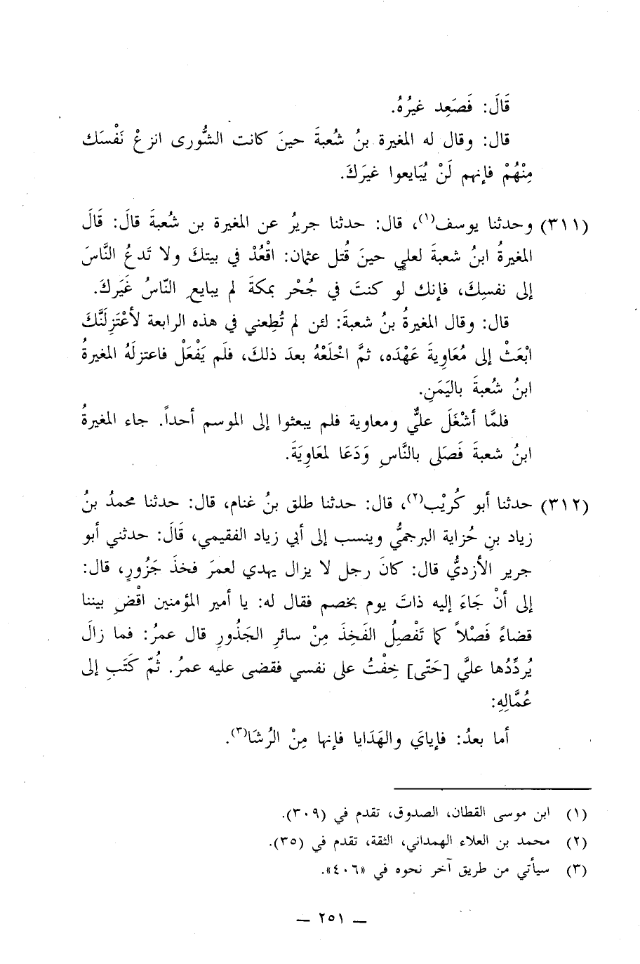 311 - وَحَدَّثَنَا يُوسُفُ، قَالَ: حَدَّثَنَا جَرِيرٌ، عَنِ الْمُغِيرَةِ بْنِ شُعْبَةَ، قَالَ: قَالَ الْمُغِيرَةُ بْنُ شُعْبَةَ لِعَلِيٍّ حِينَ قُتِلَ عُثْمَانُ: §اقْعُدْ فِي بَيْتِكَ وَلَا تَدْعُ النَّاسَ إِلَى نَفْسِكَ فَإِنَّكَ لَوْ كُنْتَ فِي جُحْرٍ بِمَكَّةَ لَمْ يُبَايِعِ النَّاسُ غَيْرَكَ. قَالَ: وَقَالَ الْمُغِيرَةُ بْنُ شُعْبَةَ: لَئِنْ لَمْ تُطِعْنِي فِي هَذِهِ الرَّابِعَةِ لَأَعْتَزِلَنَّكَ، ابْعَثْ إِلَى مُعَاوِيَةَ عَهْدَهُ ثُمَّ اخْلَعْهُ بَعْدَ ذَلِكَ، فَلَمْ يَفْعَلْ، فَاعْتَزَلَهُ الْمُغِيرَةُ بْنُ شُعْبَةَ بِالْيَمَنِ فَلَمَّا أُشْغِلَ عَلِيٌّ وَمُعَاوِيَةُ فَلَمْ يَبْعَثُوا إِلَى الْمَوْسِمِ أَحَدًا جَاءَ الْمُغِيرَةُ بْنُ شُعْبَةَ فَصَلَّى بِالنَّاسِ وَدَعَا لِمُعَاوِيَةَ