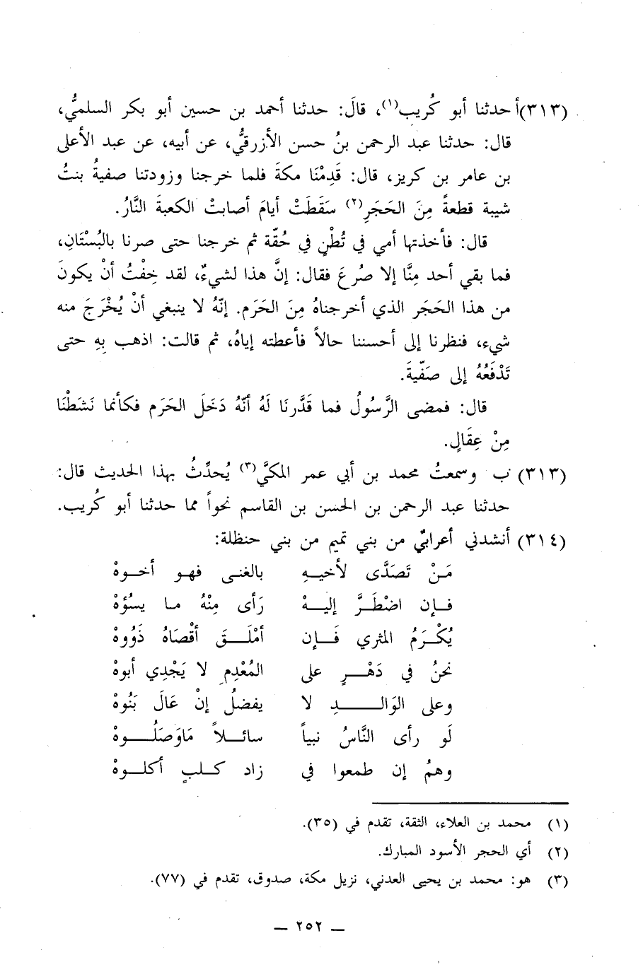 313 - حَدَّثَنَا أَبُو كُرَيْبٍ، قَالَ: حَدَّثَنَا أَحْمَدُ بْنُ حُسَيْنٍ أَبُو بَكْرٍ السُّلَمِيُّ، قَالَ: حَدَّثَنَا عَبْدُ الرَّحْمَنِ بْنُ حَسَنٍ الْأَزْرَقِيُّ، عَنْ أَبِيهِ، عَنْ عَبْدِ الْأَعْلَى بْنِ عَامِرِ بْنِ كَرِيزٍ، قَالَ: قَدِمْنَا مَكَّةَ فَلَمَّا خَرَجْنَا وَزَوَّدَتْنَا صَفِيَّةُ بِنْتُ شَيْبَةَ قِطْعَةً مِنَ الْحَجَرِ سَقَطَتْ §أَيَّامَ أَصَابَتِ الْكَعْبَةَ النَّارُ. قَالَ: فَأَخَذَتْهَا أُمِّي فِي قَطَنٍ فِي حِقَّةٍ ثُمَّ خَرَجْنَا حَتَّى صِرْنَا بِالْبُسْتَانِ فَمَا بَقِيَ أَحَدٌ مِنَّا إِلَّا صُرِعَ , فَقَالَ: إِنَّ هَذَا لَشَيْءٌ لَقَدْ خِفْتُ أَنْ يَكُونَ مِنْ هَذَا الْحَجَرِ الَّذِي أَخْرَجْنَاهُ مِنَ الْحَرَمِ إِنَّهُ لَا يَنْبَغِي أَنْ يَخْرُجَ مِنْهُ شَيْءٌ فَنَظَرْنَا إِلَى أَحْسَنِنَا حَالًا فَأَعْطَتْهُ إِيَّاهُ ثُمَّ قَالَتِ: اذْهَبْ بِهِ حَتَّى تَدْفَعَهُ إِلَى صَفِيَّةَ قَالَ: فَمَضَى الرَّسُولُ فَمَا قَدَّرْنَا لَهُ أَنَّهُ دَخَلَ الْحَرَمَ فَكَأَنَّمَا نَشِطْنَا مِنْ عِقَالٍ - وَسَمِعْتُ مُحَمَّدَ بْنَ أَبِي عُمَرَ الْمَكِّيَّ، يُحَدِّثُ بِهَذَا الْحَدِيثِ قَالَ: حَدَّثَنَا عَبْدُ الرَّحْمَنِ بْنُ الْحَسَنِ بْنِ الْقَاسِمِ، نَحْوًا مِمَّا حَدَّثَنَا أَبُو كُرَيْبٍ