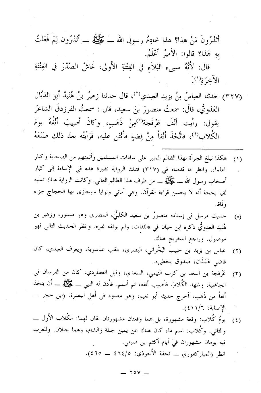 327 - حَدَّثَنَا الْعَبَّاسُ بْنُ يَزِيدَ الْعَبْدِيُّ، قَالَ: حَدَّثَنَا زُهَيْرُ بْنُ هنيدٍ أَبُو الذَّيَّالِ الْعَدَوِيُّ، قَالَ: سَمِعْتُ مَنْصُورَ بْنَ سَعِيدٍ، قَالَ: سَمِعْتُ الْفَرَزْدَقَ الشَّاعِرَ، يَقُولُ: §رَأَيْتُ أَنْفَ عَرْفَجَةَ مِنْ ذَهَبٍ وَكَانَ أُصِيبَ أَنْفُهُ يَوْمَ الْكُلَابِ فَاتَّخَذَ أَنْفًا مِنْ فِضَّةٍ فَأَنْتَنَ عَلَيْهِ فَرَأَيْتُهُ بَعْدَ ذَلِكَ صَنَعَهُ -[258]- مِنْ ذَهَبٍ. وَزَعَمَ مَنْصُورٌ أَنَّ النَّبِيَّ صَلَّى اللهُ عَلَيْهِ وَسَلَّمَ أَمَرَهُ بِذَلِكَ