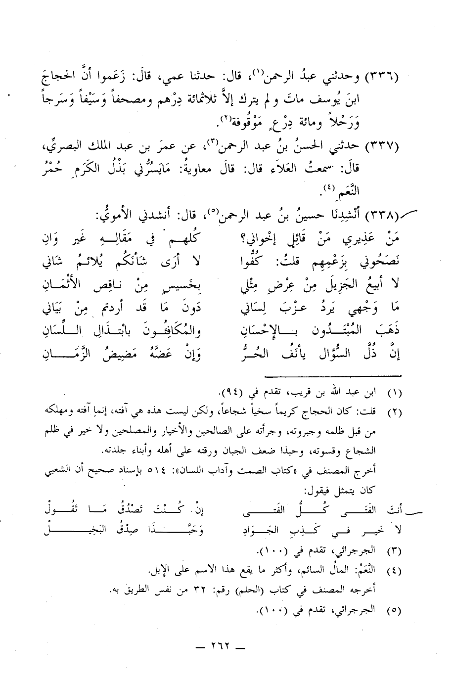 338 - أَنْشَدَنَا حُسَيْنُ بْنُ عَبْدِ الرَّحْمَنِ، قَالَ: §أَنْشَدَنِي الْأُمَوِيُّ: