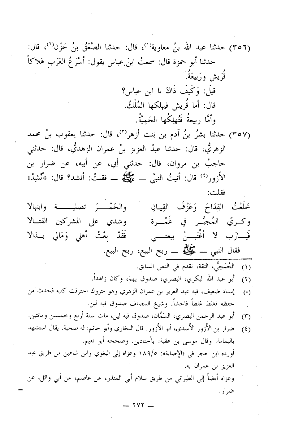 356 - حَدَّثَنَا عَبْدُ اللَّهِ بْنُ مُعَاوِيَةَ، قَالَ: حَدَّثَنَا الصَّعْقُ بْنُ حَزْنٍ، قَالَ: حَدَّثَنَا أَبُو جَمْرَةَ، قَالَ: سَمِعْتُ ابْنَ عَبَّاسٍ، يَقُولُ: §أَسْرَعُ الْعَرَبِ هَلَاكًا قُرَيْشٌ وَرَبِيعَةُ قِيلَ: وَكَيْفَ ذَاكَ يَا ابْنَ عَبَّاسٍ؟ قَالَ: أَمَّا قُرَيْشٌ فَيُهْلِكُهَا الْمُلْكُ وَأَمَّا رَبِيعَةُ فَتُهْلِكُهَا الْحَمِيَّةُ