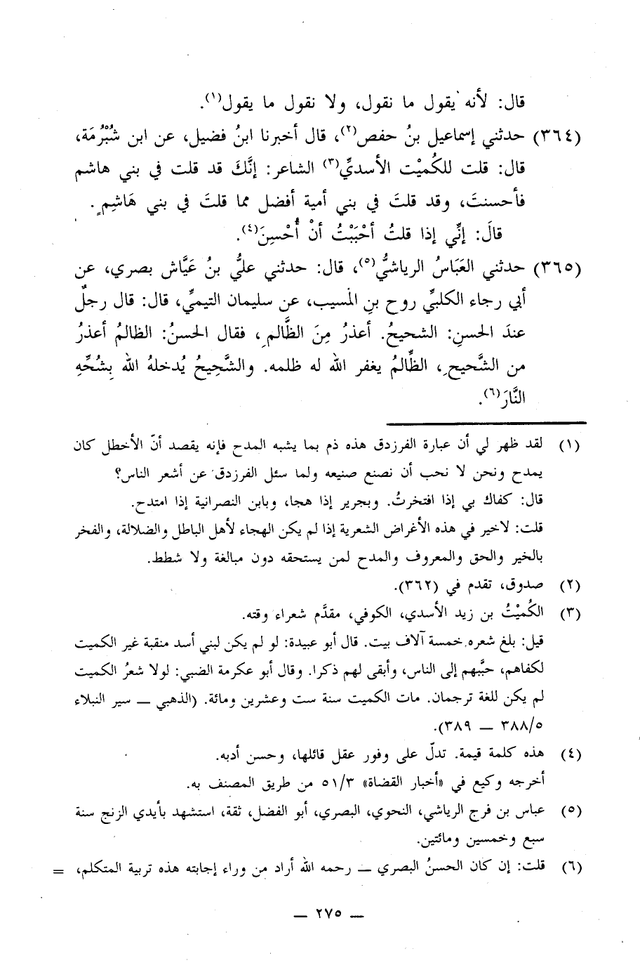 364 - حَدَّثَنِي إِسْمَاعِيلُ بْنُ حَفْصٍ، قَالَ: أَخْبَرَنَا ابْنُ فُضَيْلٍ، عَنِ ابْنِ شُبْرُمَةَ، قَالَ: §قُلْتُ لِلْكُمَيْتِ الْأَسَدِيِّ الشَّاعِرِ: إِنَّكَ قَدْ قُلْتَ فِي بَنِي هَاشِمٍ فَأَحْسَنْتَ وَقَدْ قُلْتَ فِي بَنِي أُمَيَّةَ أَفْضَلَ مِمَّا قُلْتَ فِي بَنِي هَاشِمٍ، قَالَ: إِنِّي إِذَا قُلْتُ أَحْبَبْتُ أَنْ أُحْسِنَ