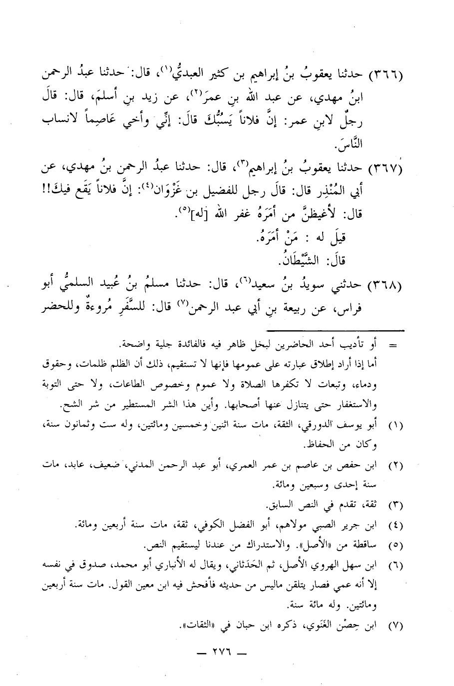 366 - حَدَّثَنَا يَعْقُوبُ بْنُ إِبْرَاهِيمَ بْنِ كَثِيرٍ الْعَبْدِيُّ، قَالَ: حَدَّثَنَا عَبْدُ الرَّحْمَنِ بْنُ مَهْدِيٍّ، عَنْ عَبْدِ اللَّهِ بْنِ عُمَرَ، عَنْ زَيْدِ بْنِ أَسْلَمَ، قَالَ: قَالَ رَجُلٌ لِابْنِ عُمَرَ: §إِنَّ فُلَانًا يَسُبُّكَ، قَالَ: إِنِّي وَأَخِي عَاصِمًا لَا نُسَابُّ النَّاسَ